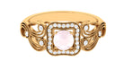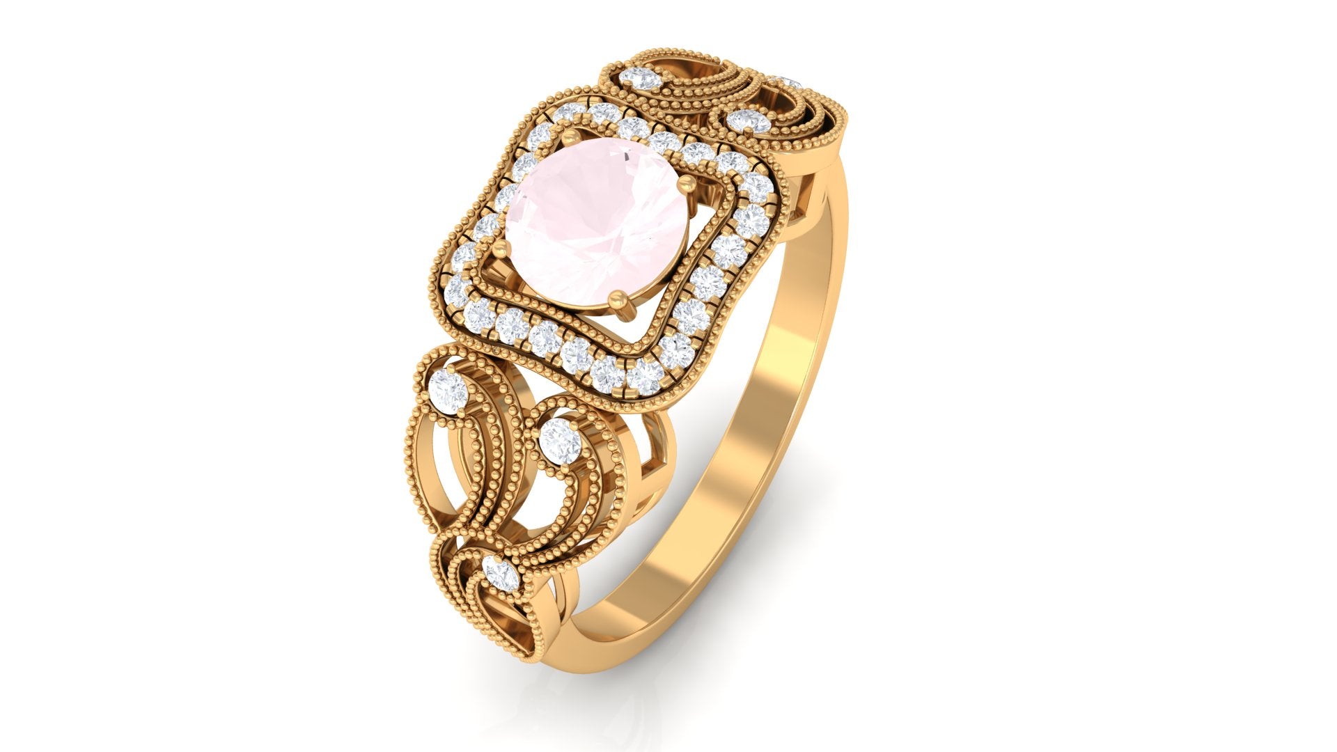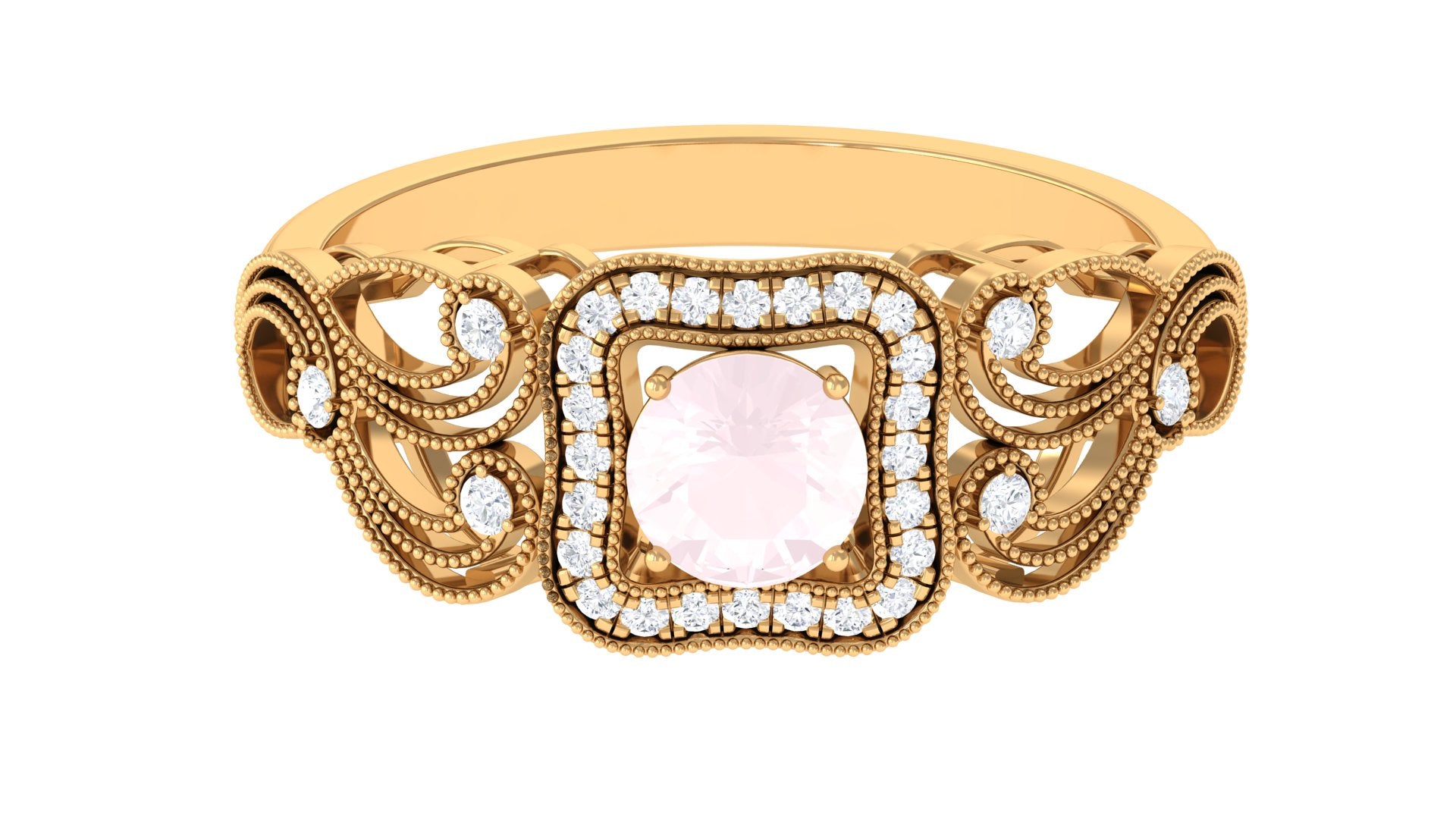 An Amazing and Fabulous Vintage Engagement Ring is a perfect gift for your lady. This Engagement Ring is decorated with Round Shape Rose Quartz in the center and a Round Diamond in a halo and side stone style. The milgrain floral design set with Diamond stones magnifies the piece. This Rose Quartz Engagement Ring is mounted in Gold Metal.
