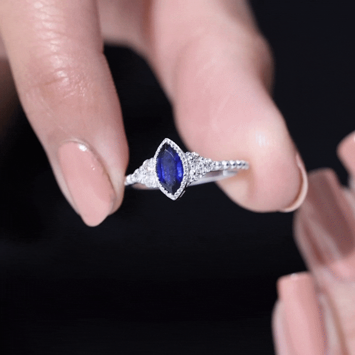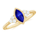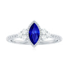 Vintage Style 0.7 Carat Lab Grown Blue Sapphire Marquise Engagement Ring with Diamond Trio