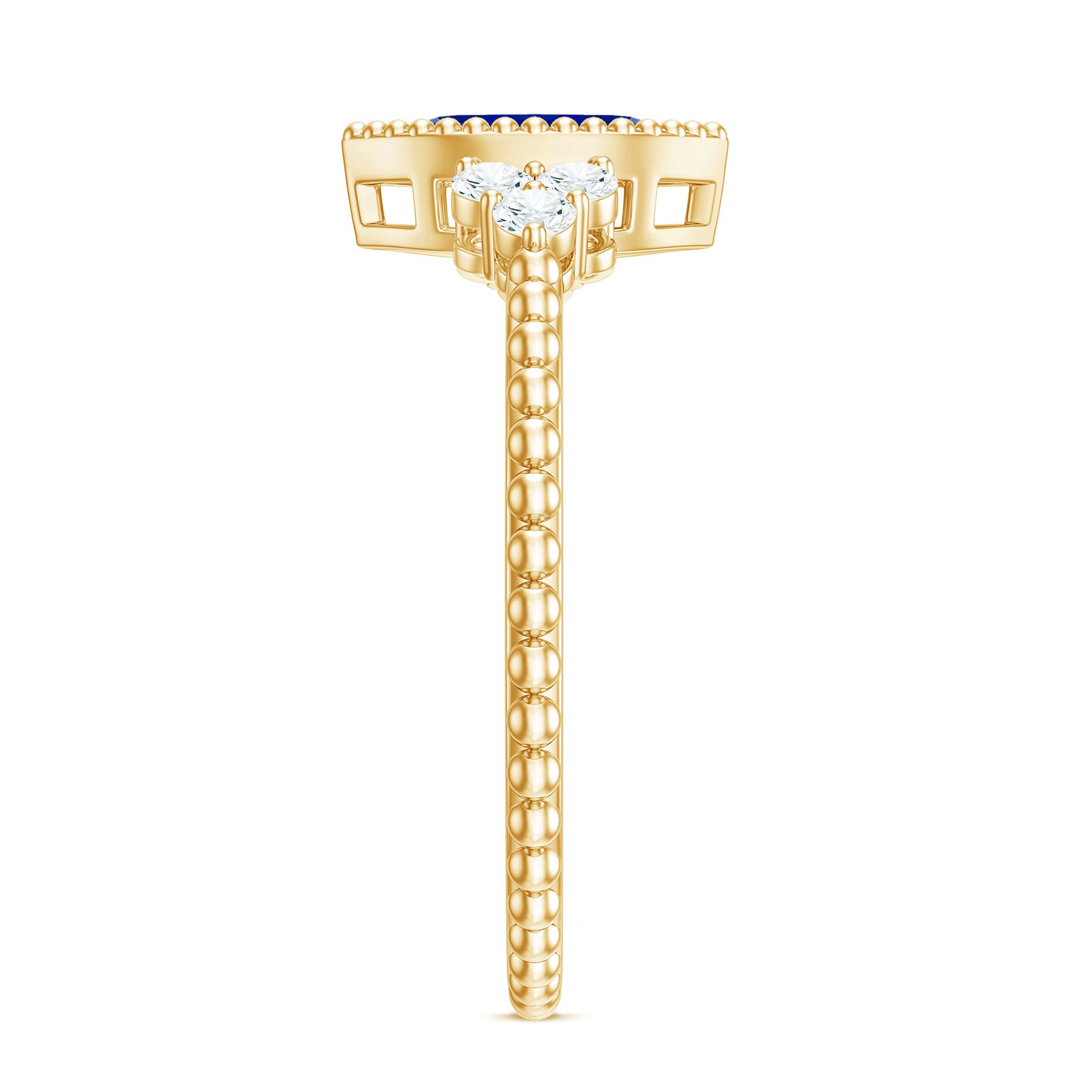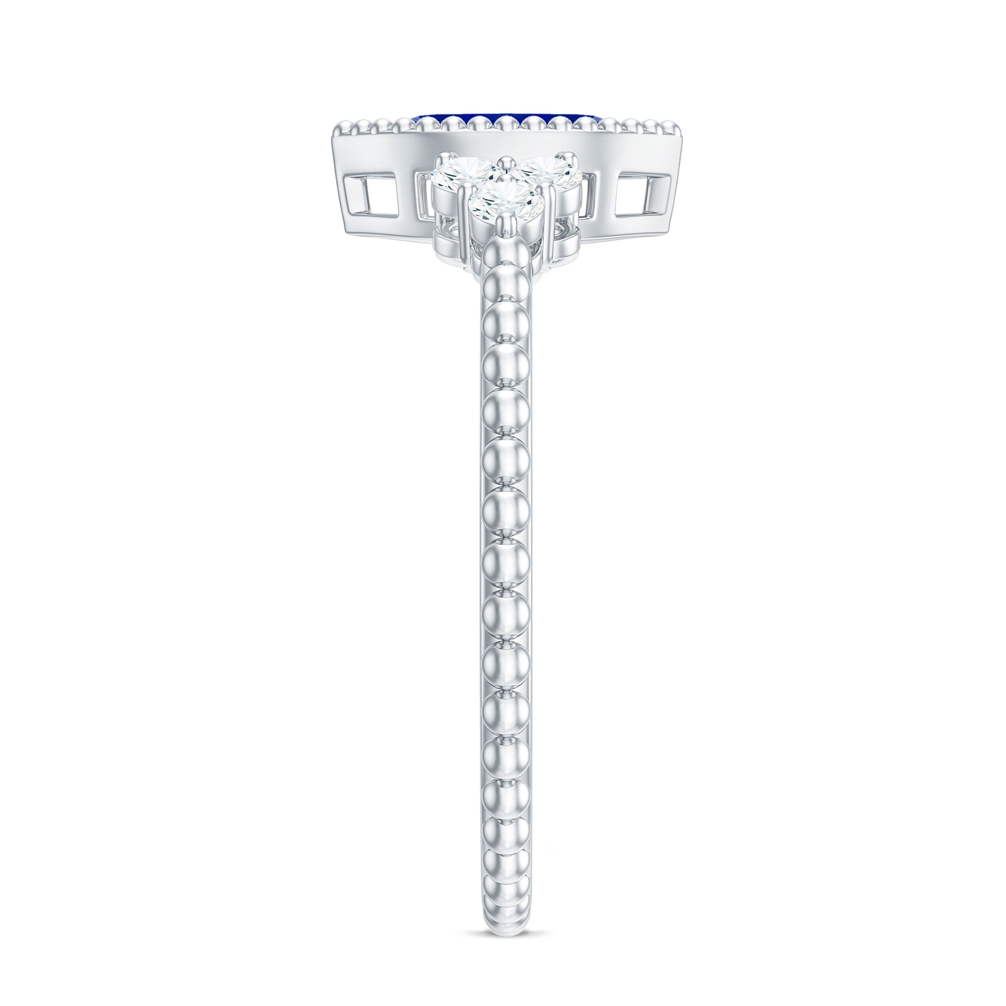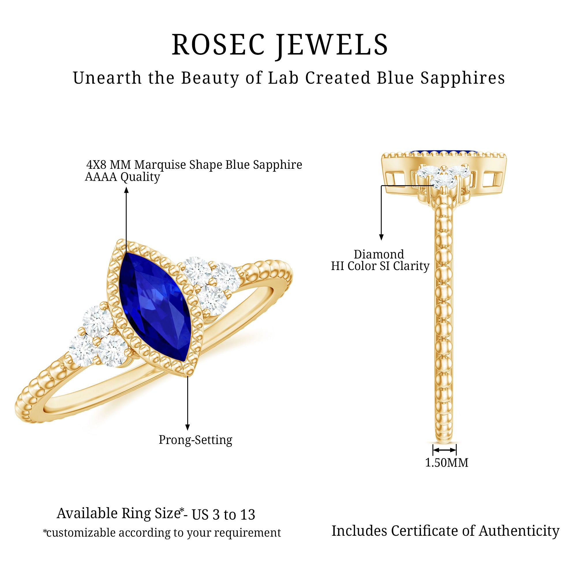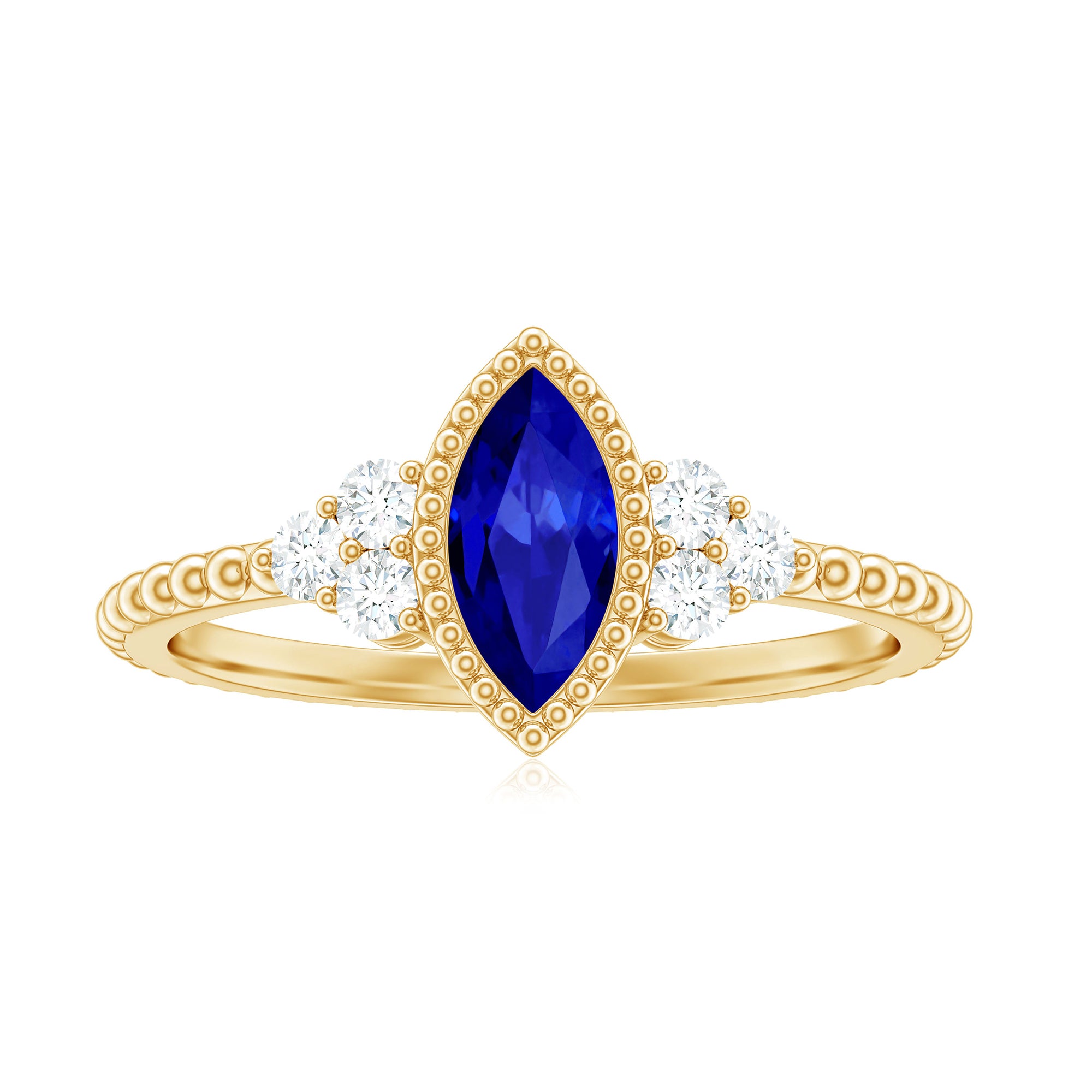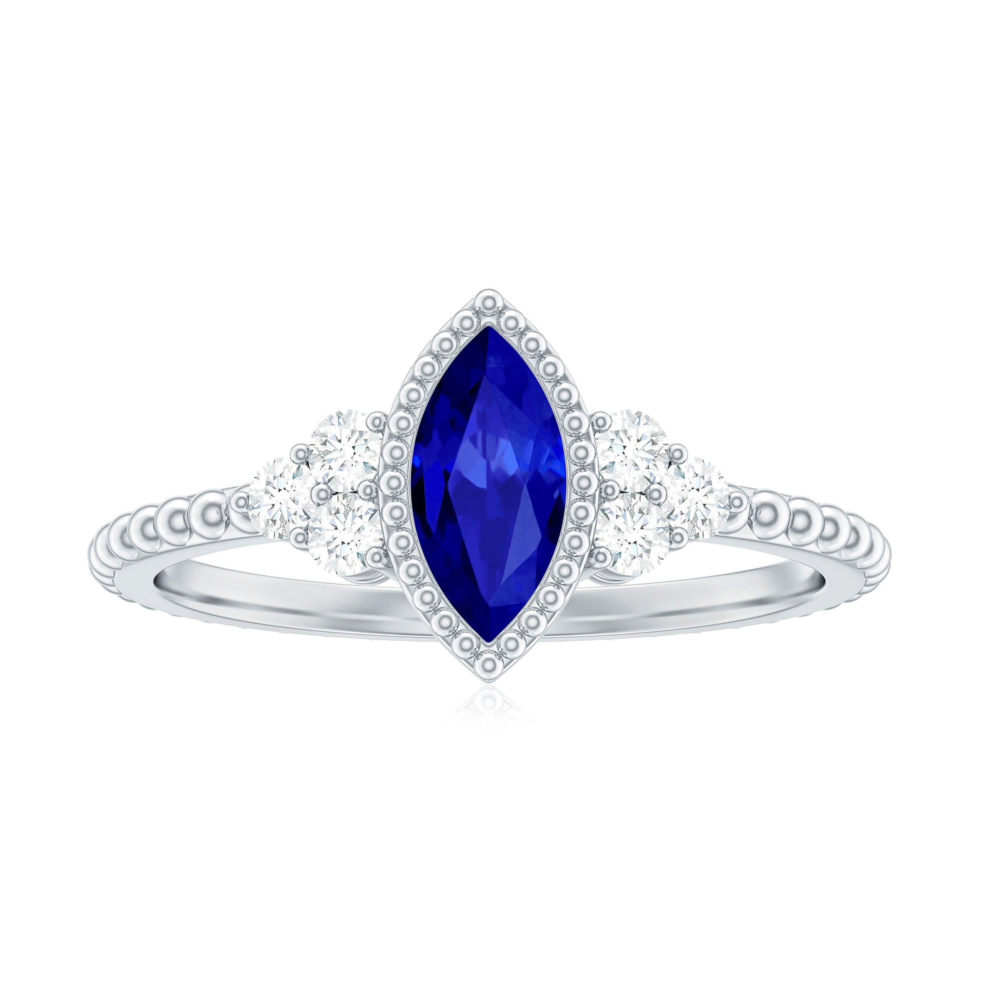 Make your special day unforgettable with this stunning Vintage Style Engagement Ring, designed to capture the essence of timeless romance. At its center lies a 4X8 mm Marquise Shaped Lab Created Blue Sapphire set in Bezel Setting, radiating a deep, captivating hue that symbolizes loyalty and devotion. Flanking the Lab Grown Blue Sapphire, a trio of sparkling Round Shape Diamond stones adds a touch of brilliance, while Beaded Detailing along the band and around the centerpiece evokes an old-world charm with modern elegance. This Marquise Engagement Ring is both unique and meaningful, perfect for marking the beginning of your lifelong journey together. Whether it is the shimmer of the AAAA Quality Lab Grown Blue Sapphire under soft light or the gentle sparkle of the HI-SI Quality Diamond stones, every glance at this Bezel Set Engagement Ring tells a story of love that endures. Offered in a variety of ring sizes and accompanied by a signature jewelry box, this Lab Grown Blue Sapphire Engagement Ring is ready to be treasured for generations. Ideal for those who want a piece that is as enchanting as the bond it represents, this Lab Blue Sapphire Diamond Ring blends classic sophistication with contemporary grace, making it a symbol of your promise and a dazzling reminder of the moments that matter most.