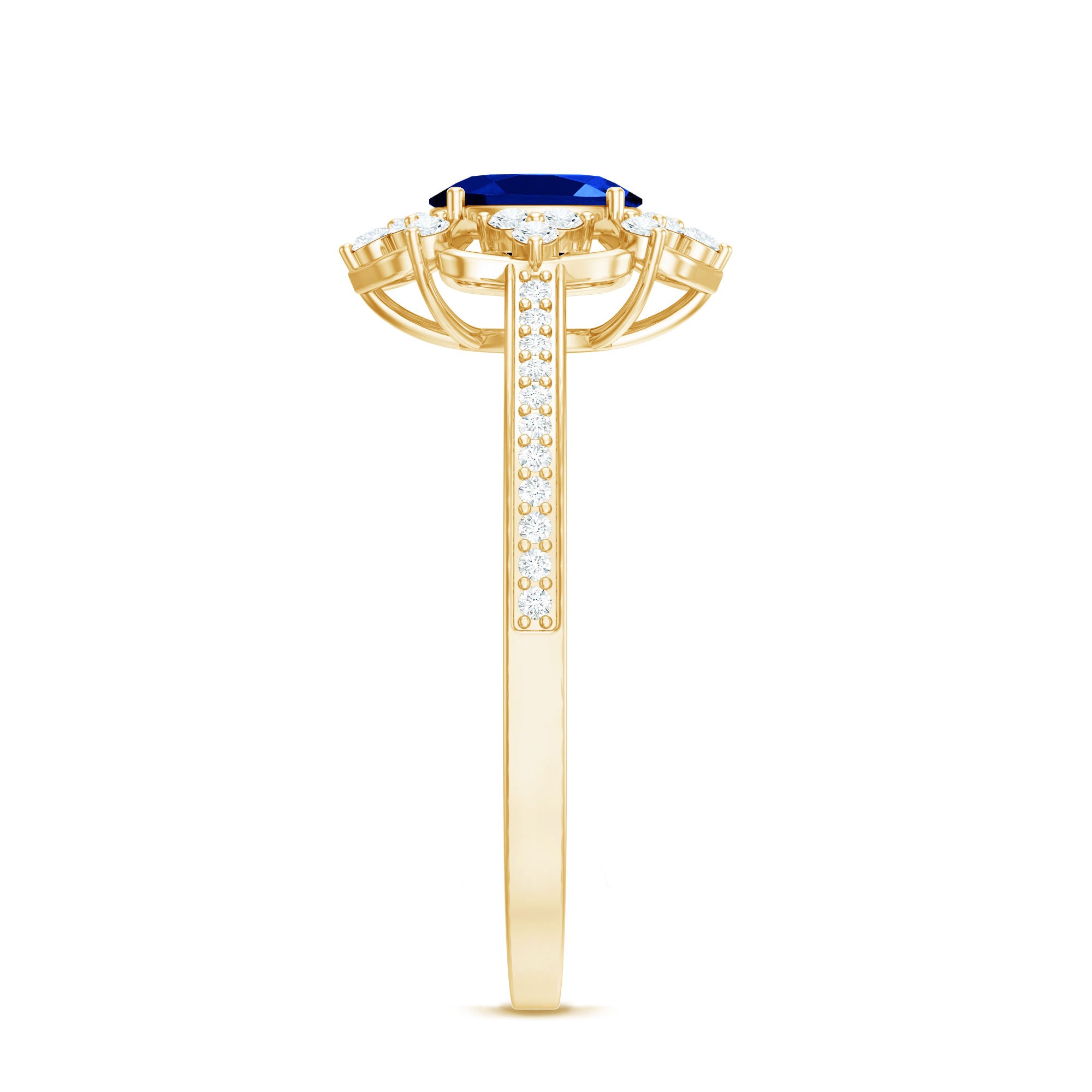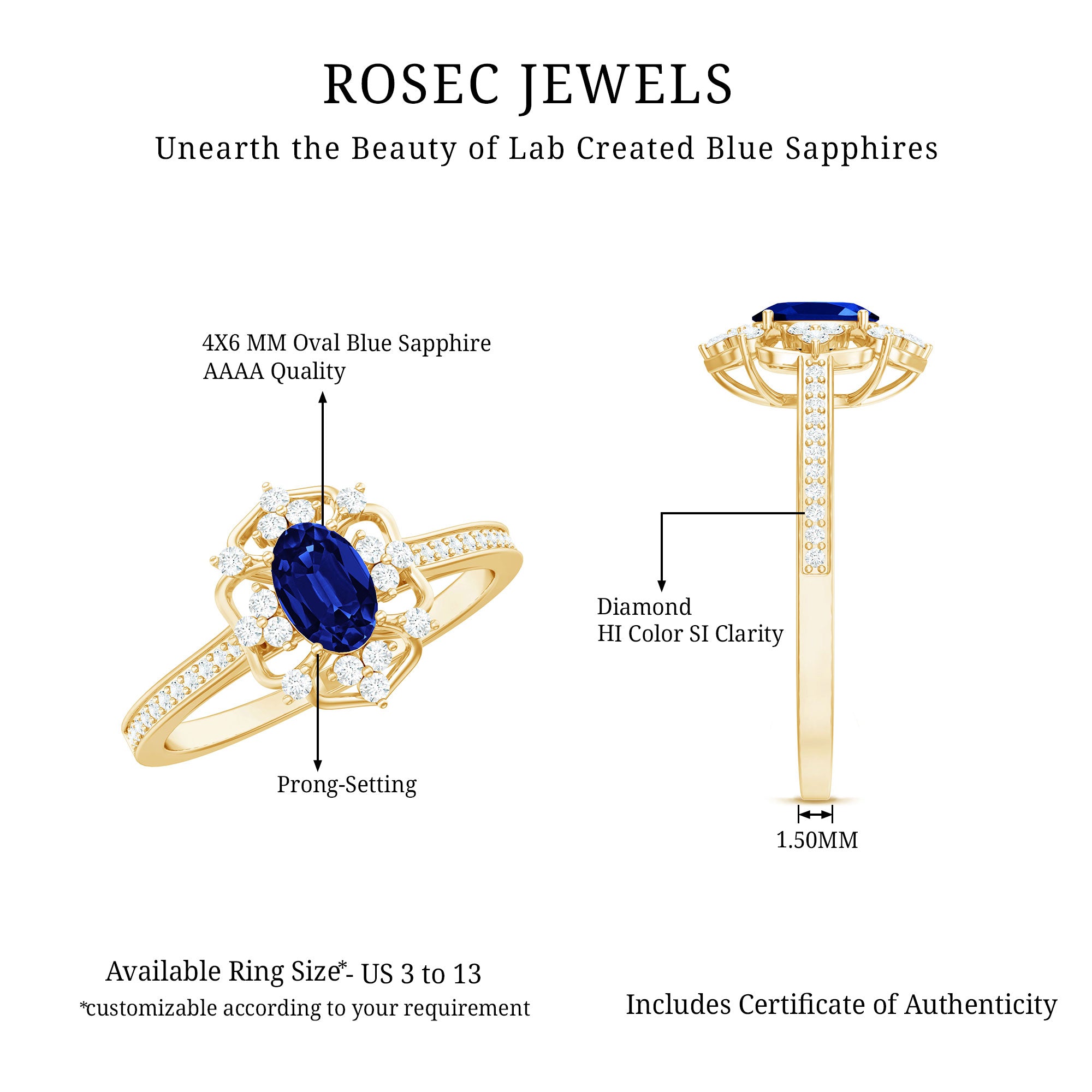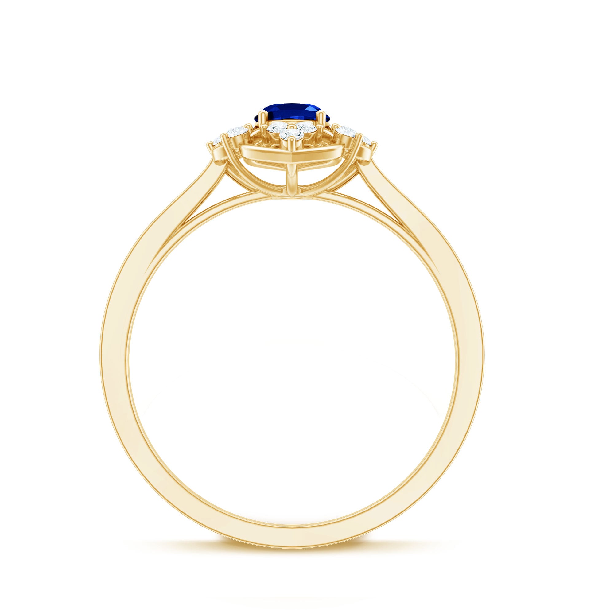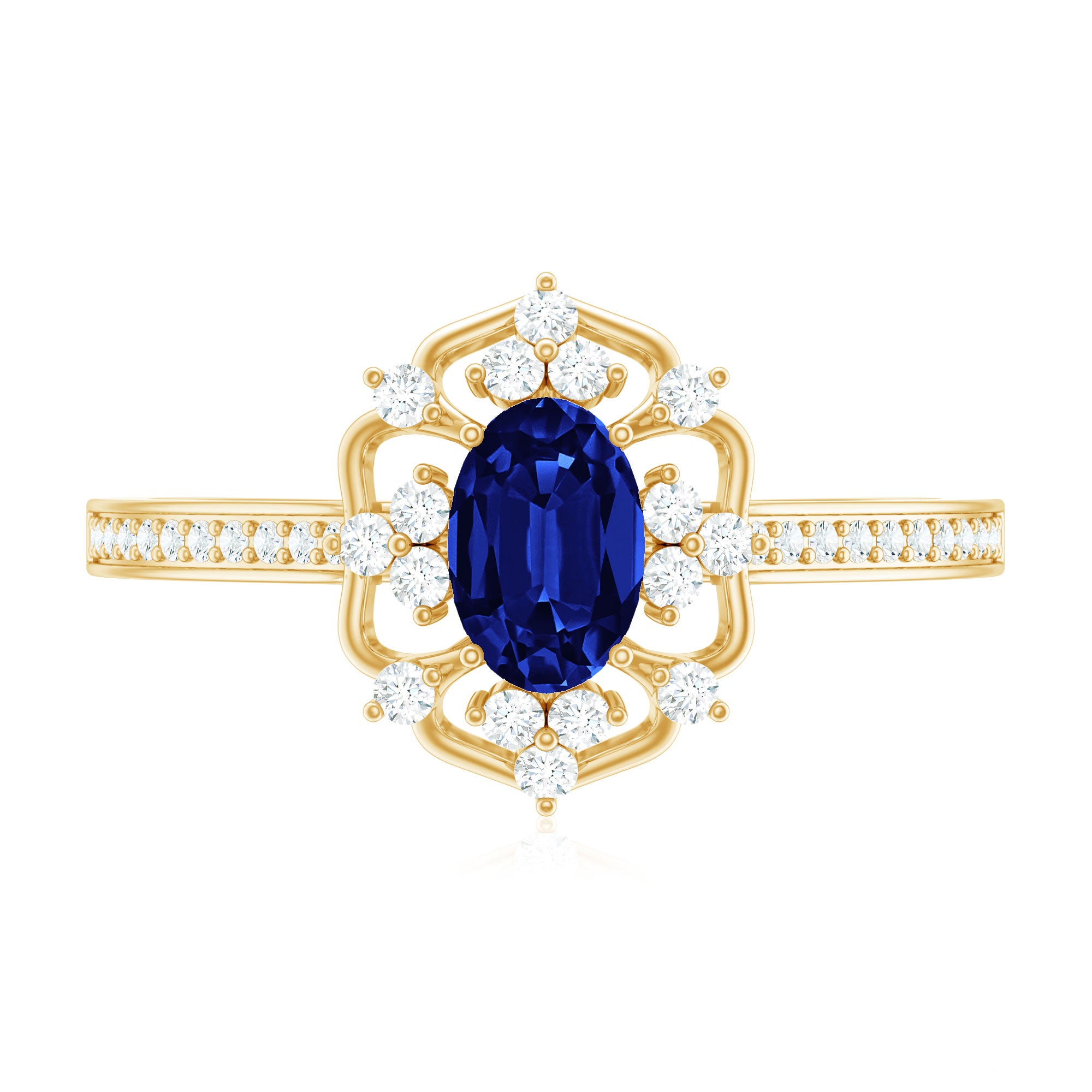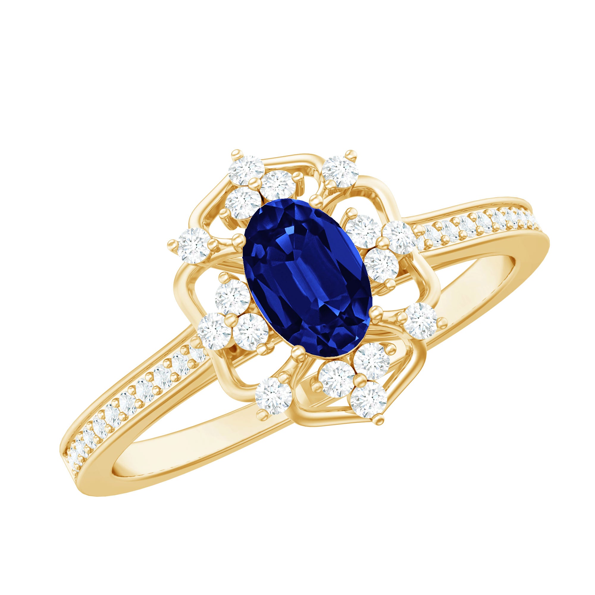 Surprise your beloved with this refined Vintage Inspired Floral Engagement Ring, a stunning piece that exudes elegance and charm. The centerpiece of this exquisite ring is an Oval Cut Created Blue Sapphire, beautifully showcased in a Prong Setting and accented with sparkling Round Shape Diamond stones. The ring is crafted with Solid Gold, adding to its timeless appeal. Give your special someone a gift that she will cherish forever, and symbolize your love with this magnificent Floral Engagement Ring.