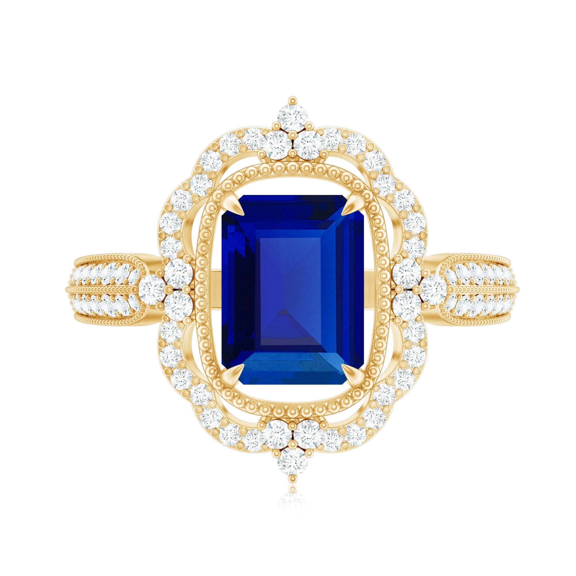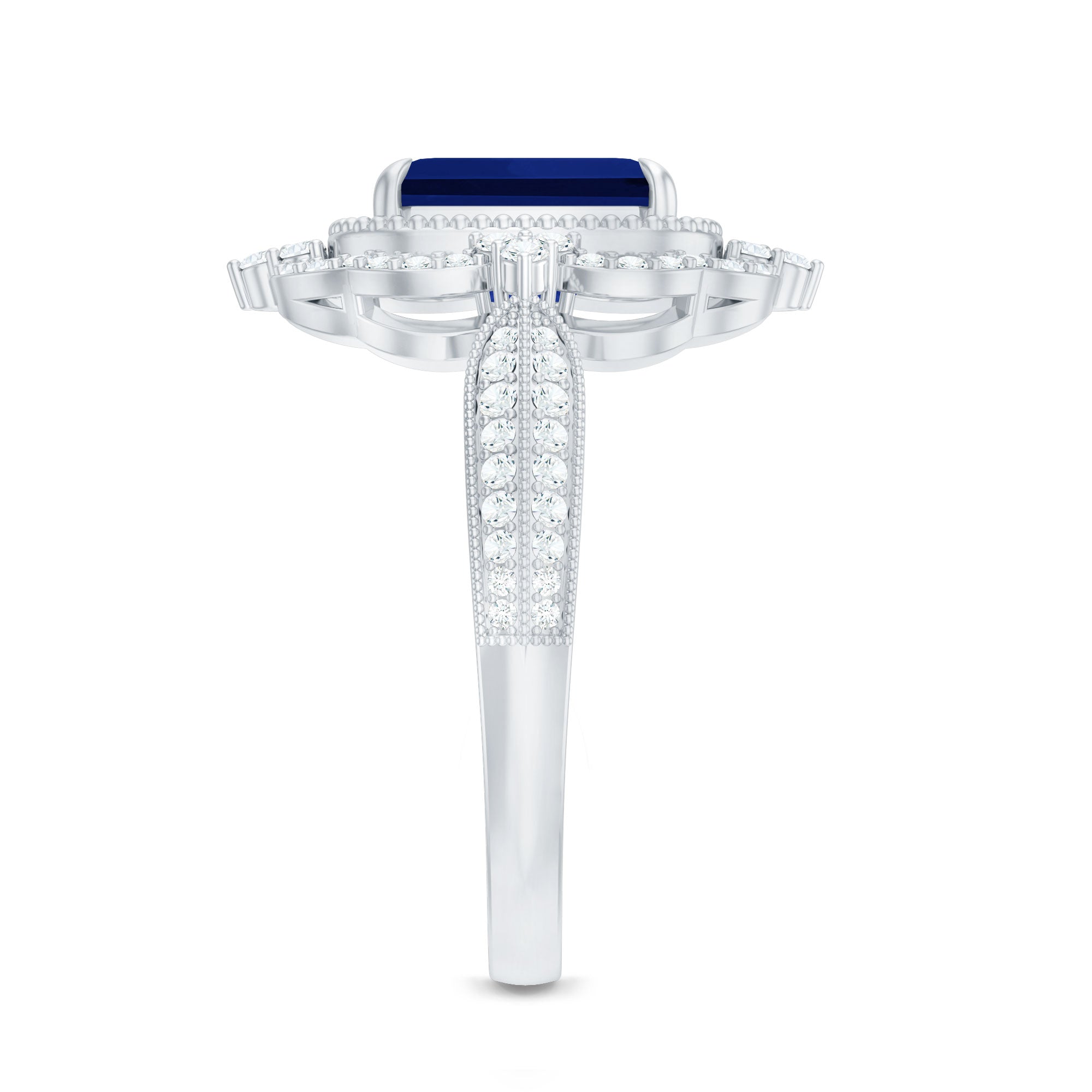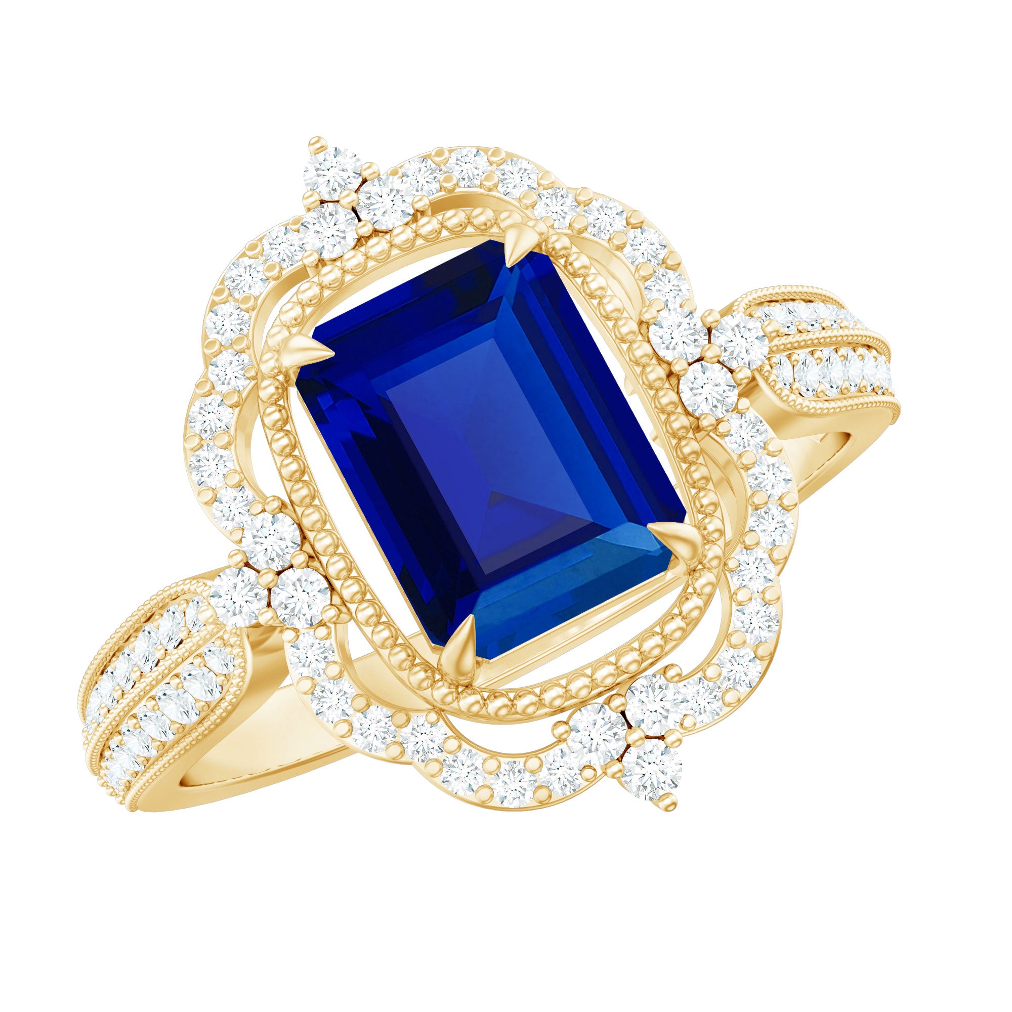 Add a touch of luxury and aesthetics to your style with this Created Blue Sapphire Vintage Ring. Octagon Cut Created Blue Sapphire is held in Claw Setting beautifully and to add more charm to its beauty, there are round Diamond stones studded in a prong setting. This Created Blue Sapphire Engagement Ring exhibit high brilliance.