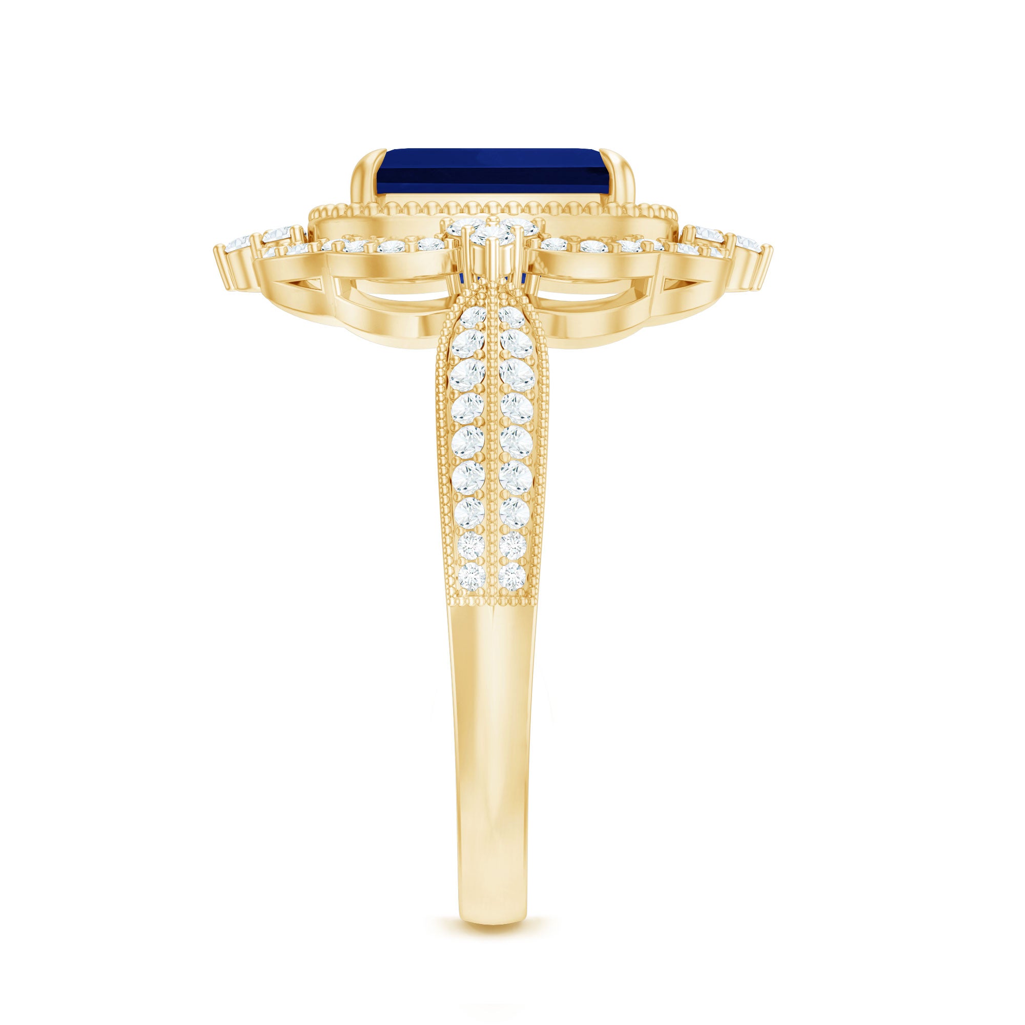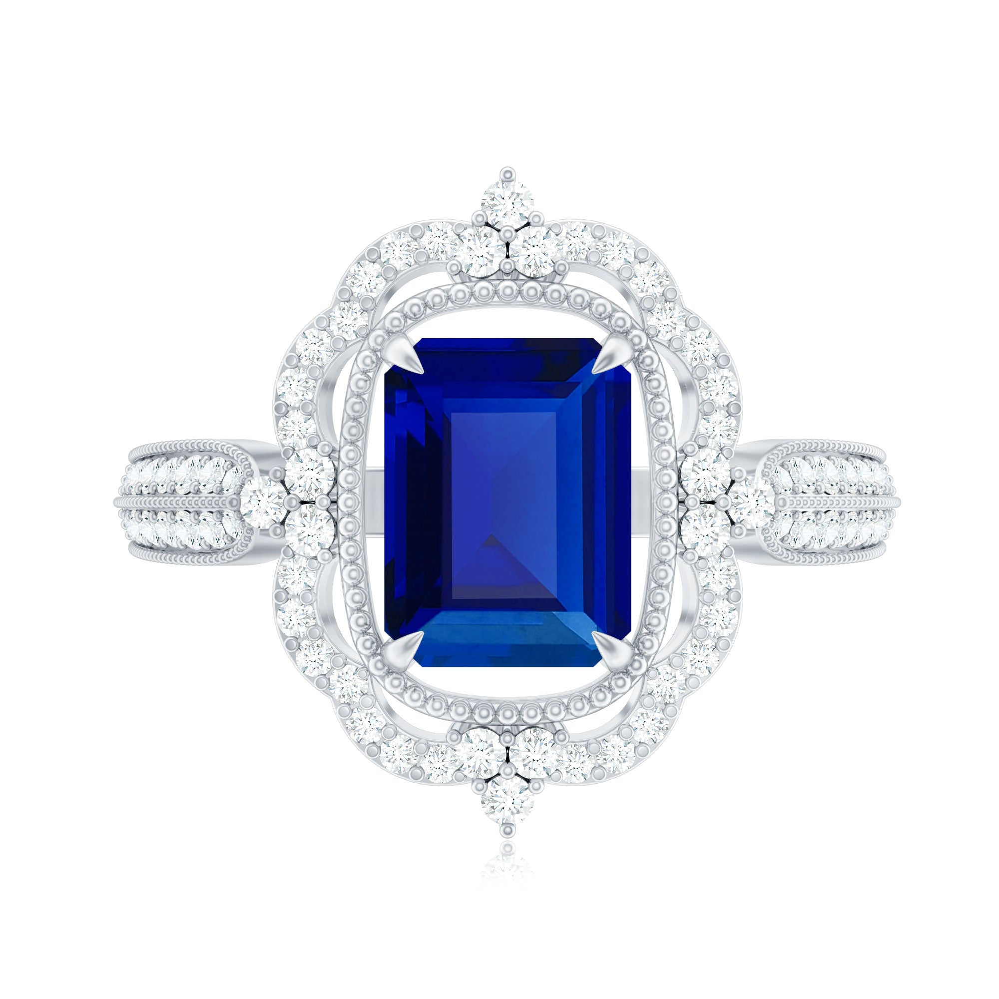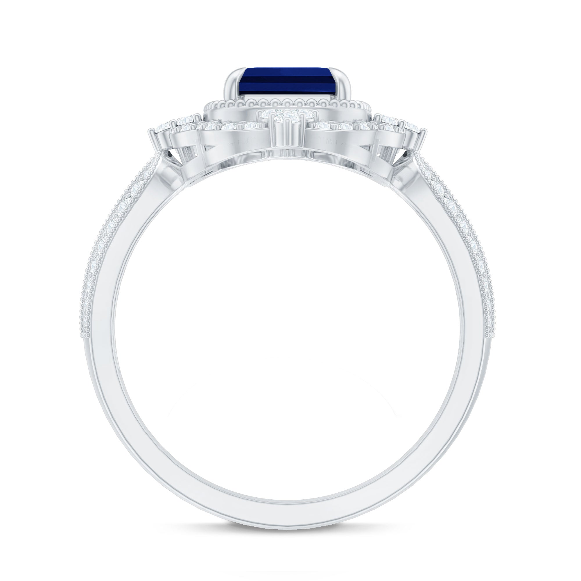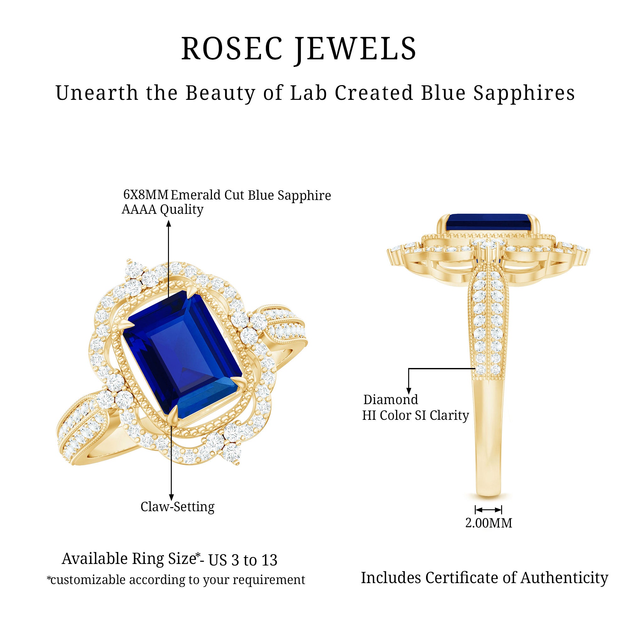 Add a touch of luxury and aesthetics to your style with this Created Blue Sapphire Vintage Ring. Octagon Cut Created Blue Sapphire is held in Claw Setting beautifully and to add more charm to its beauty, there are round Diamond stones studded in a prong setting. This Created Blue Sapphire Engagement Ring exhibit high brilliance.