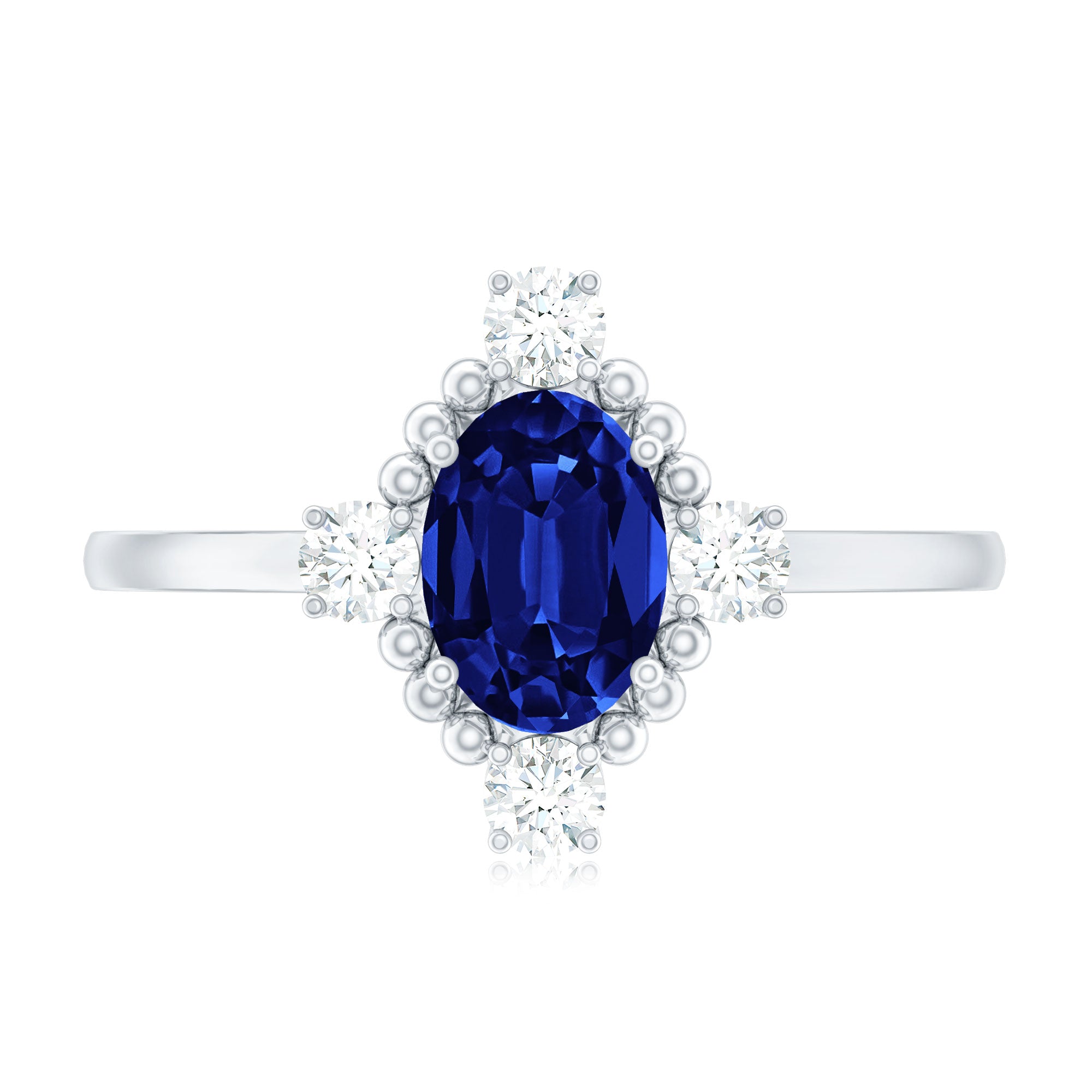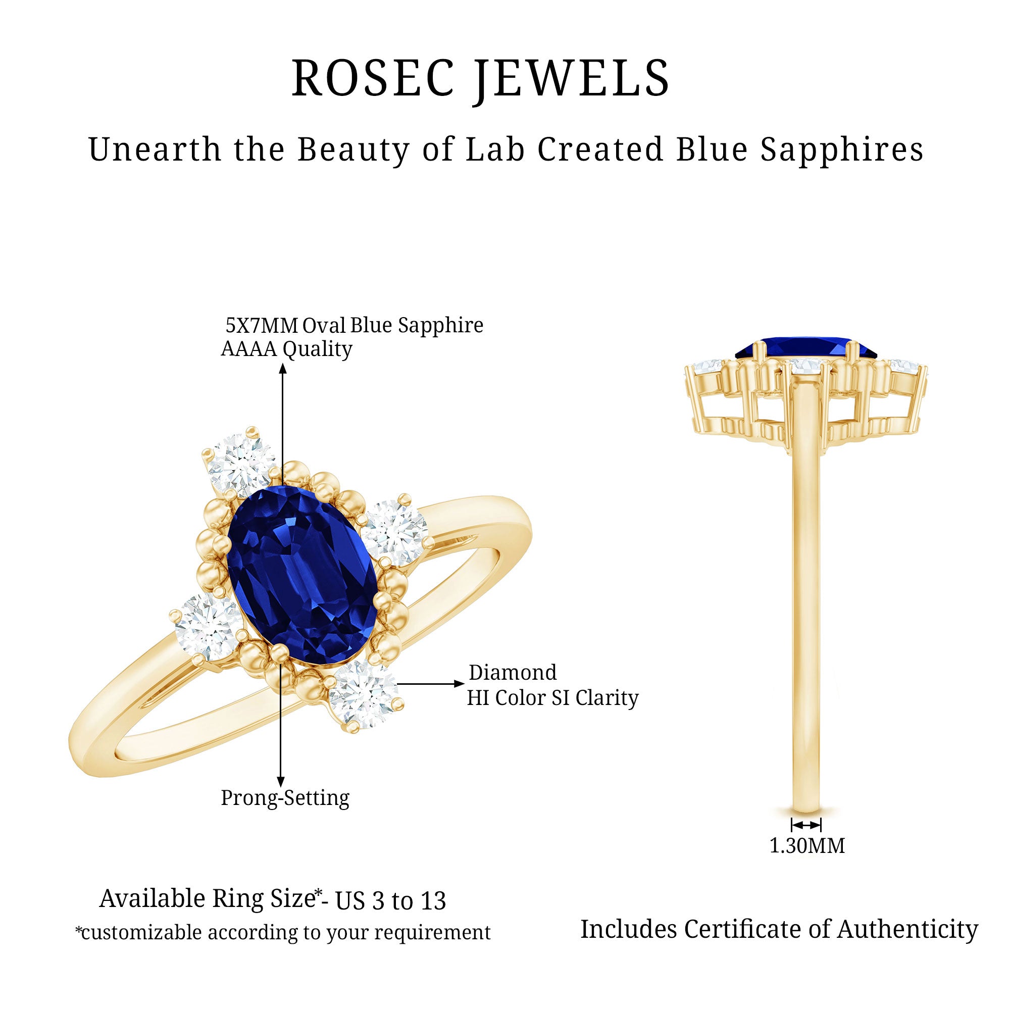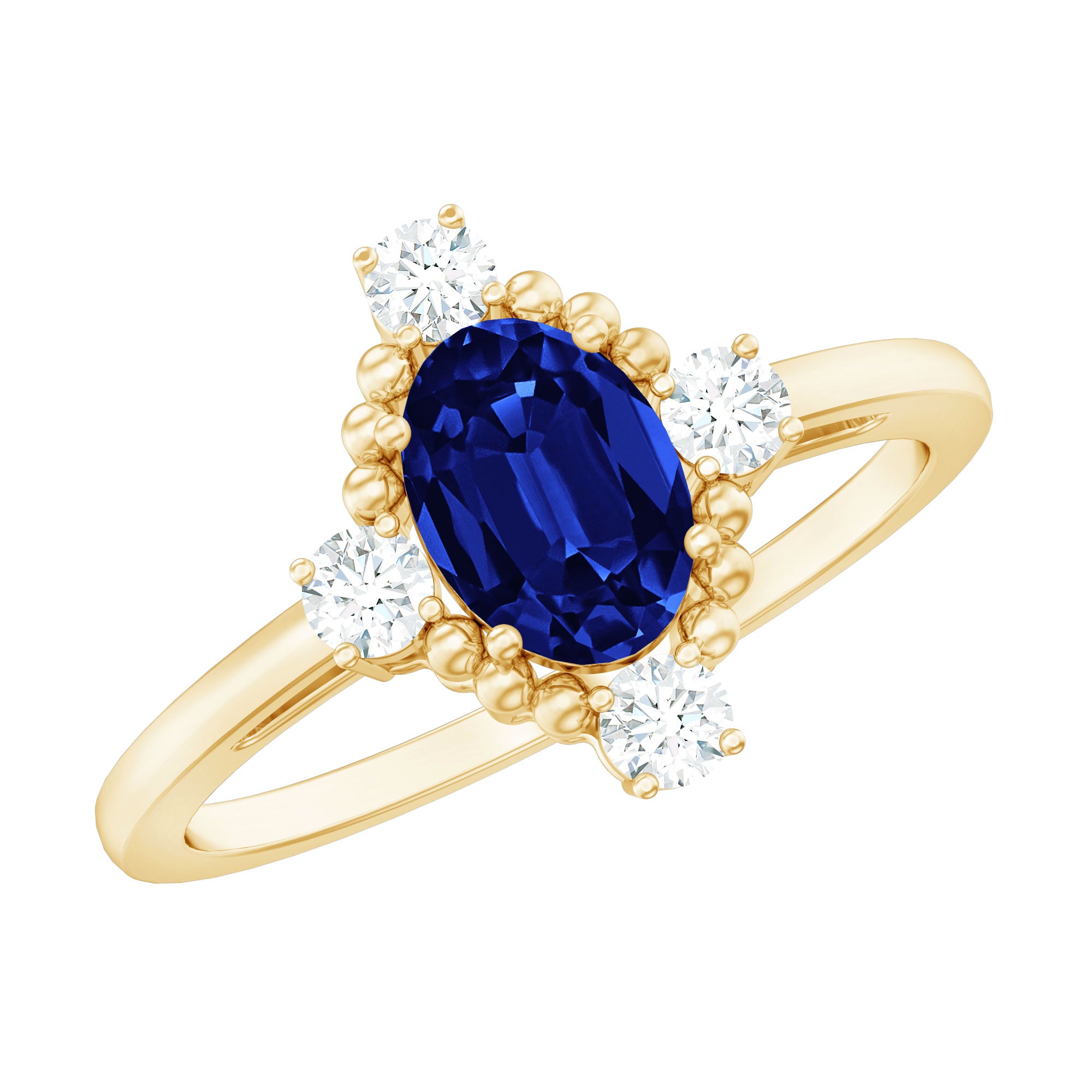 This vintage-inspired engagement ring features an oval-cut created blue sapphire solitaire, surrounded by round Diamond and beaded gold detailing. The elegant combination of the created blue sapphire and the brilliant Diamond creates a timeless and sophisticated look that is perfect for a special occasion such as an engagement or anniversary. The vintage style and attention to detail make it a piece of jewelry that will be treasured for years to come.