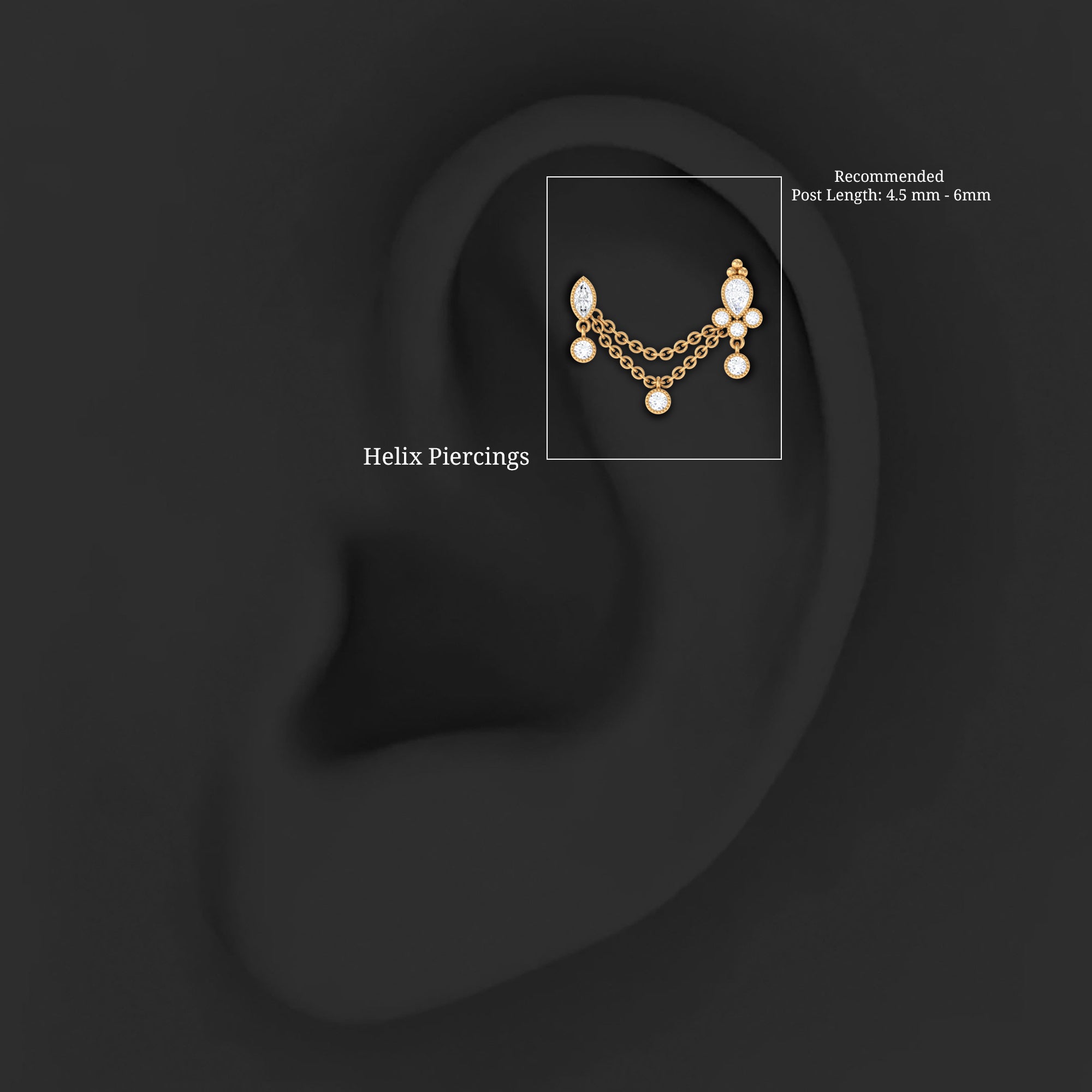 Level up your earring game with the ultimate stack essential, the Diamond Helix Earring! Showcasing diamonds all secured in beaded bezel setting, joined by a double chain, and is ready to bring the bling. Whether youre vibing with the cartilage, or upper lobe, this diamond dazzler is your go-to for making a unique style statement. You can also Gift this Double Piercing Earring to your special one for an instant win. Get ready to slay with the Diamond earring because your ears deserve some serious sparkle!