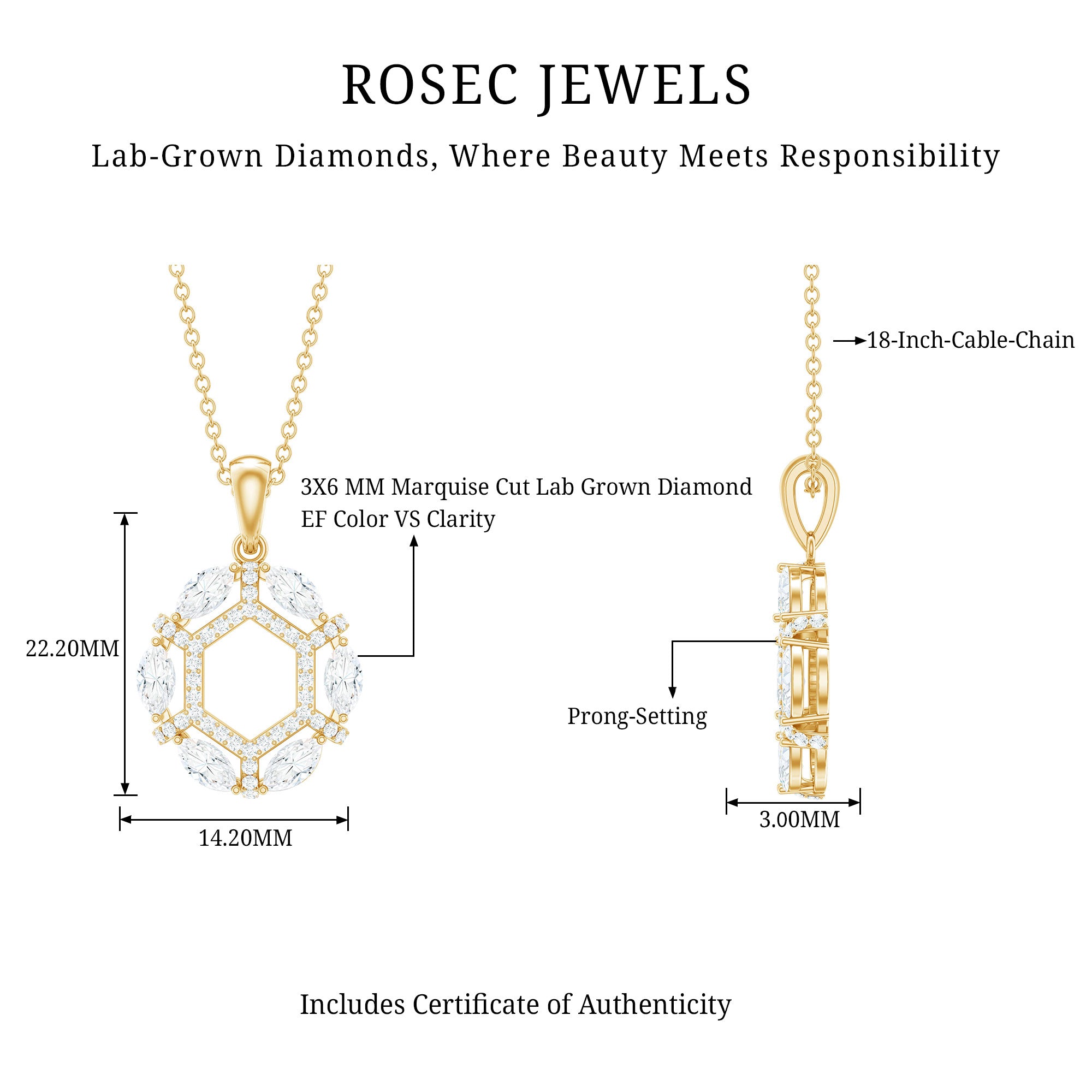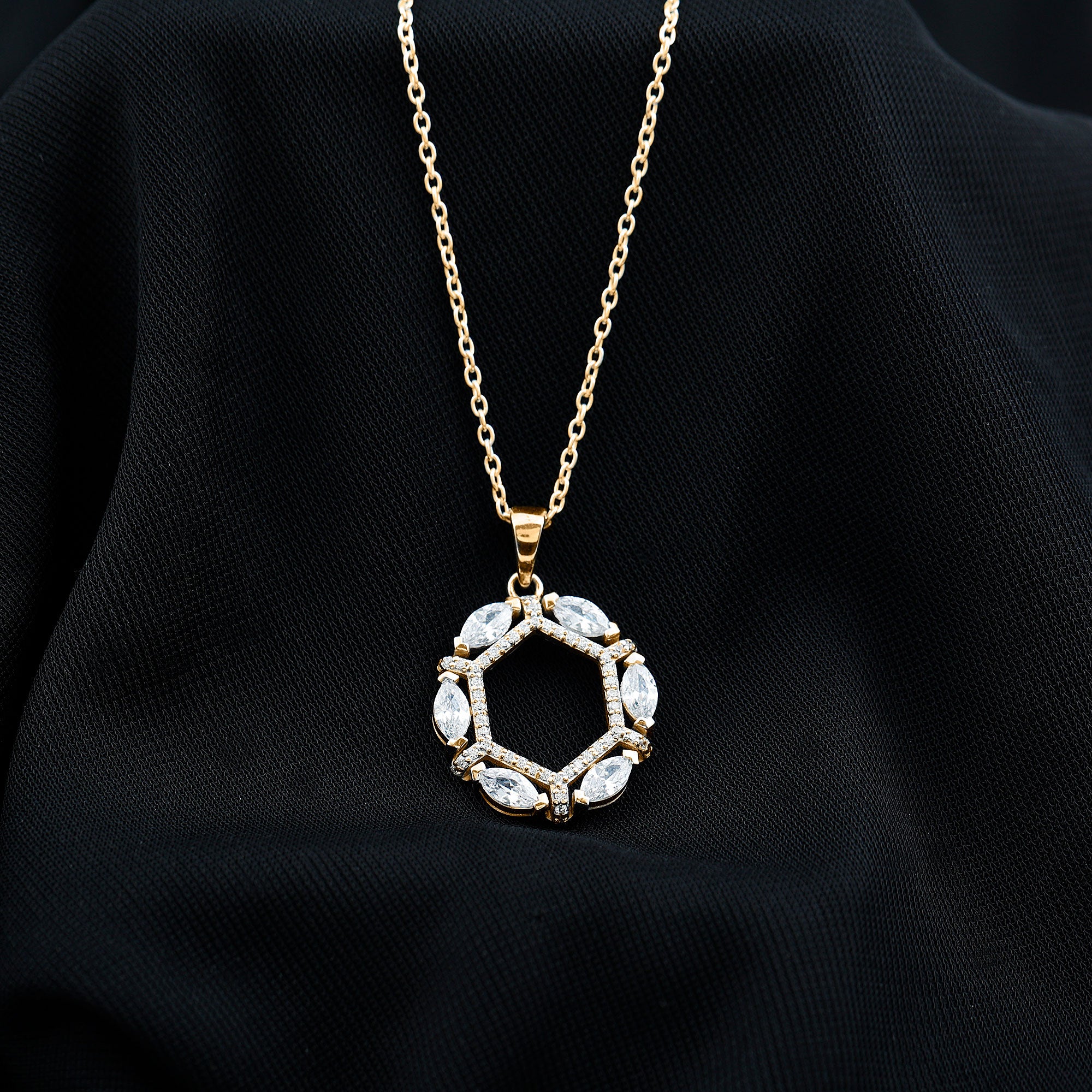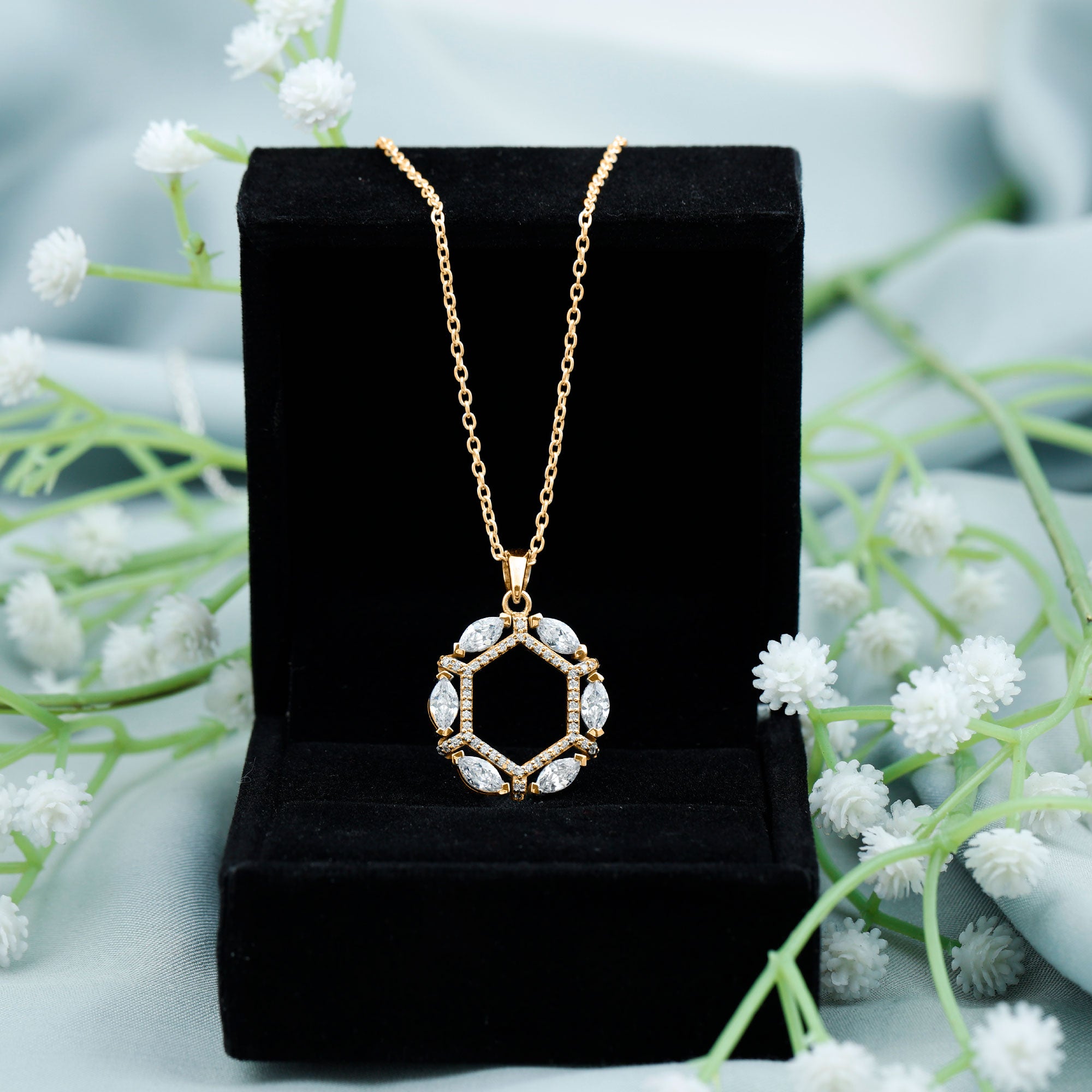 A masterpiece of artistry and sophistication, this exceptional Diamond Designer Necklace is a true statement of modern elegance. This Eternity Pendant showcases a mesmerizing hexagonal frame, curated with round and marquise shaped certified diamonds of EF-VS Quality, set in secure prong setting. The geometric structure creates a perfect balance between sophistication and contemporary flair. Handcrafted in high Quality metal by our expert artisans, this Lab Grown Diamond Pendant is a timeless statement of luxury. This beautiful Hexagon Necklace is delivered to you in a premium jewelry box and handed over to you in a ready-to-gift state.
