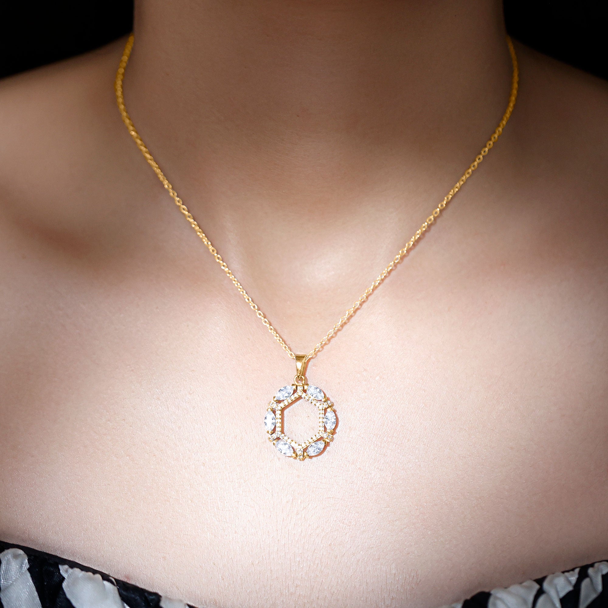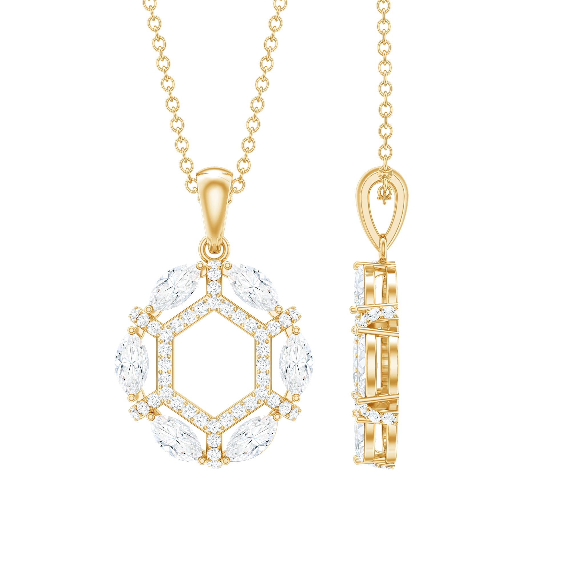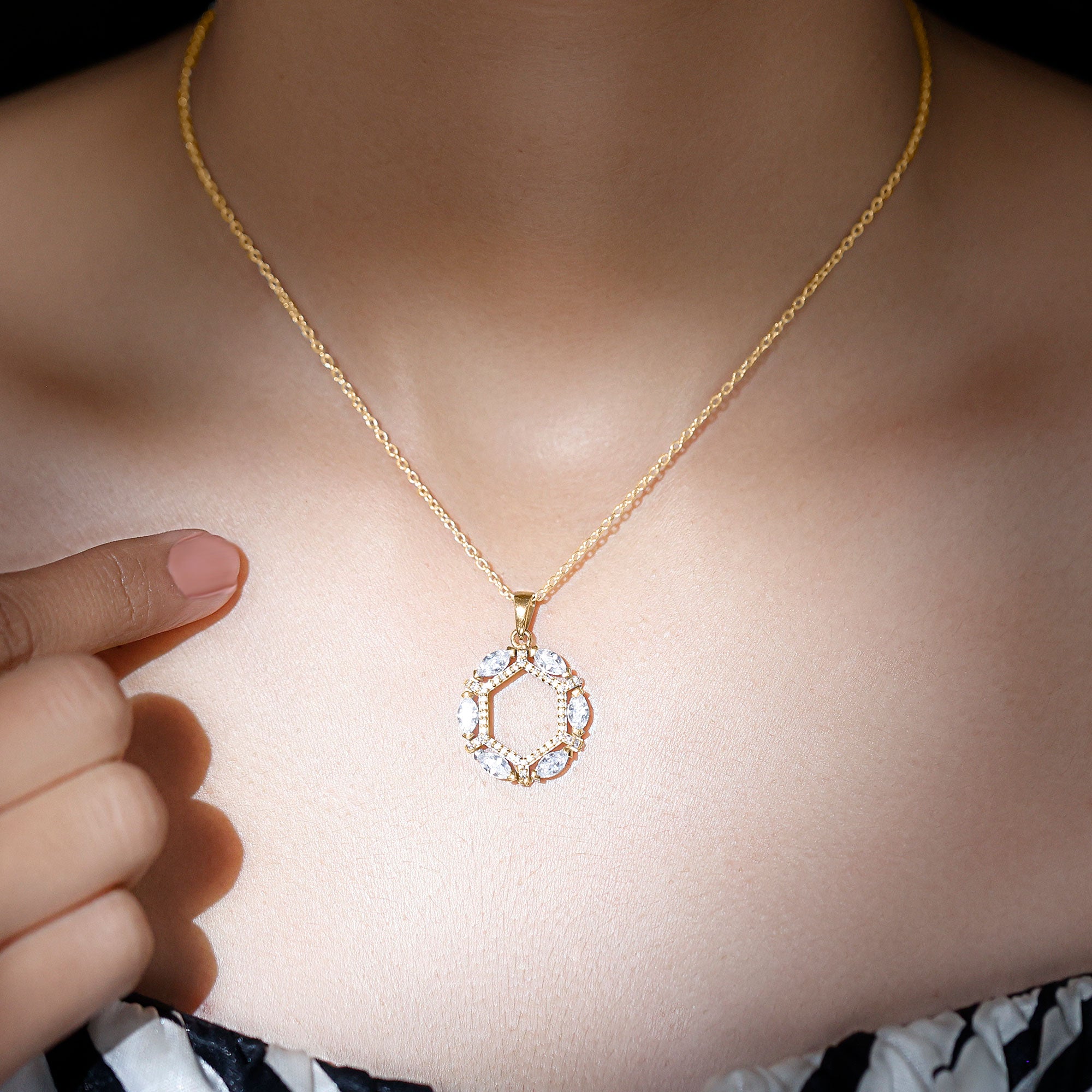 A masterpiece of artistry and sophistication, this exceptional Diamond Designer Necklace is a true statement of modern elegance. This Eternity Pendant showcases a mesmerizing hexagonal frame, curated with round and marquise shaped certified diamonds of EF-VS Quality, set in secure prong setting. The geometric structure creates a perfect balance between sophistication and contemporary flair. Handcrafted in high Quality metal by our expert artisans, this Lab Grown Diamond Pendant is a timeless statement of luxury. This beautiful Hexagon Necklace is delivered to you in a premium jewelry box and handed over to you in a ready-to-gift state.