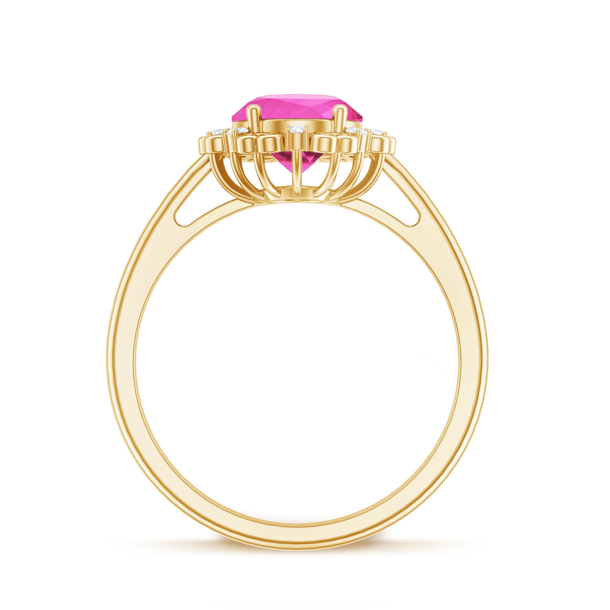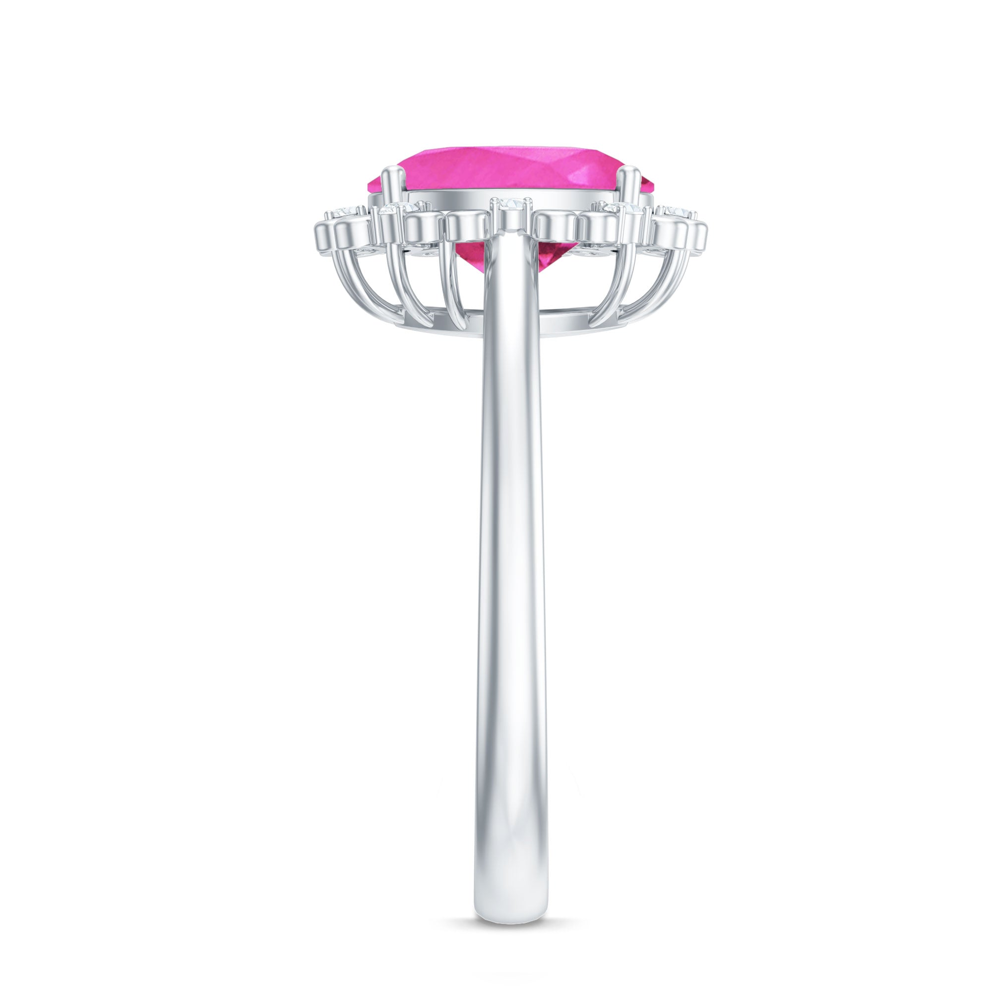 The Engagement Ring is decorated with an Oval Cut Lab Grown Pink Sapphire secured by Prong Setting, while Round Diamond add a perfect sparkle. Present this Lab-Grown Pink Sapphire Ring to your lady love and capture her priceless smile.