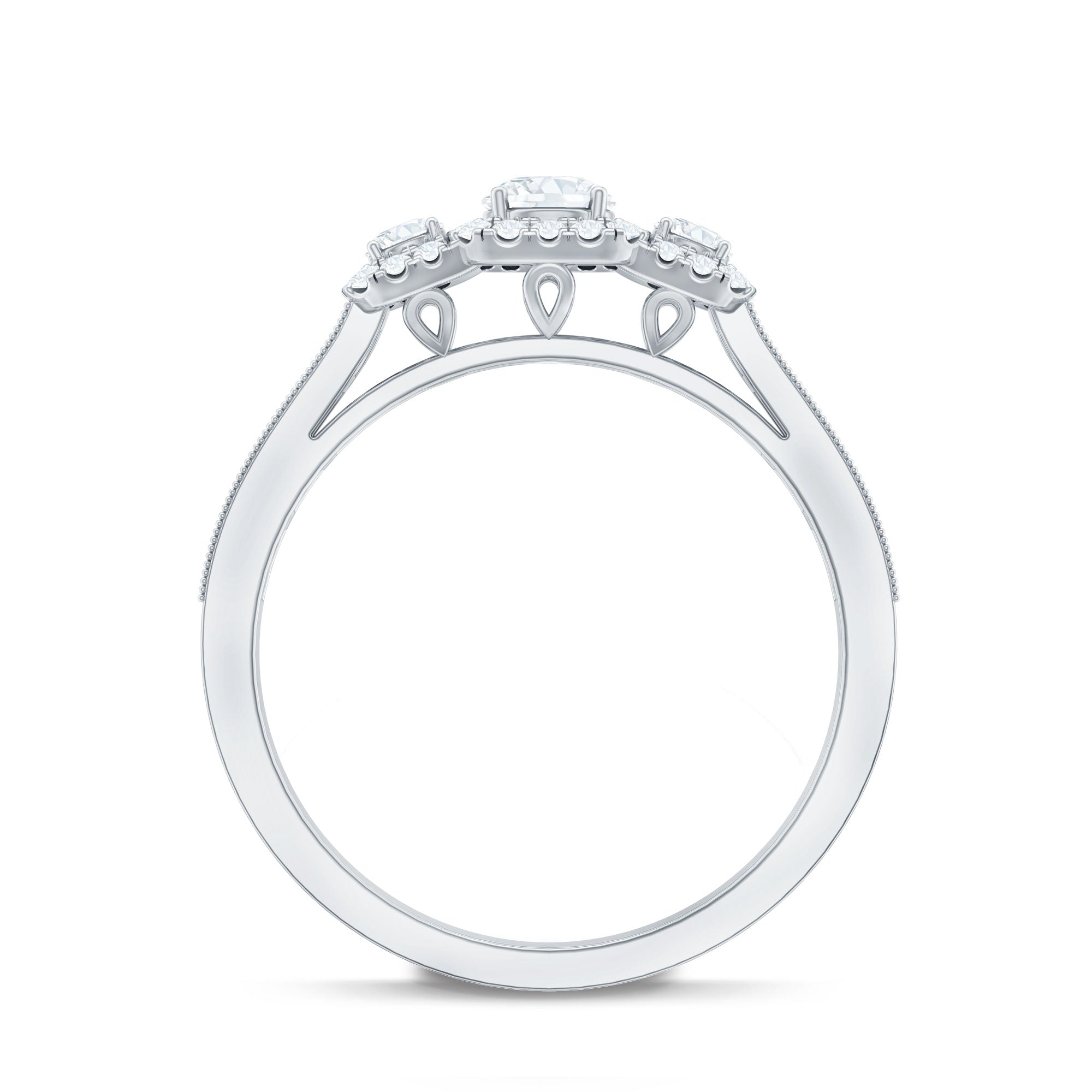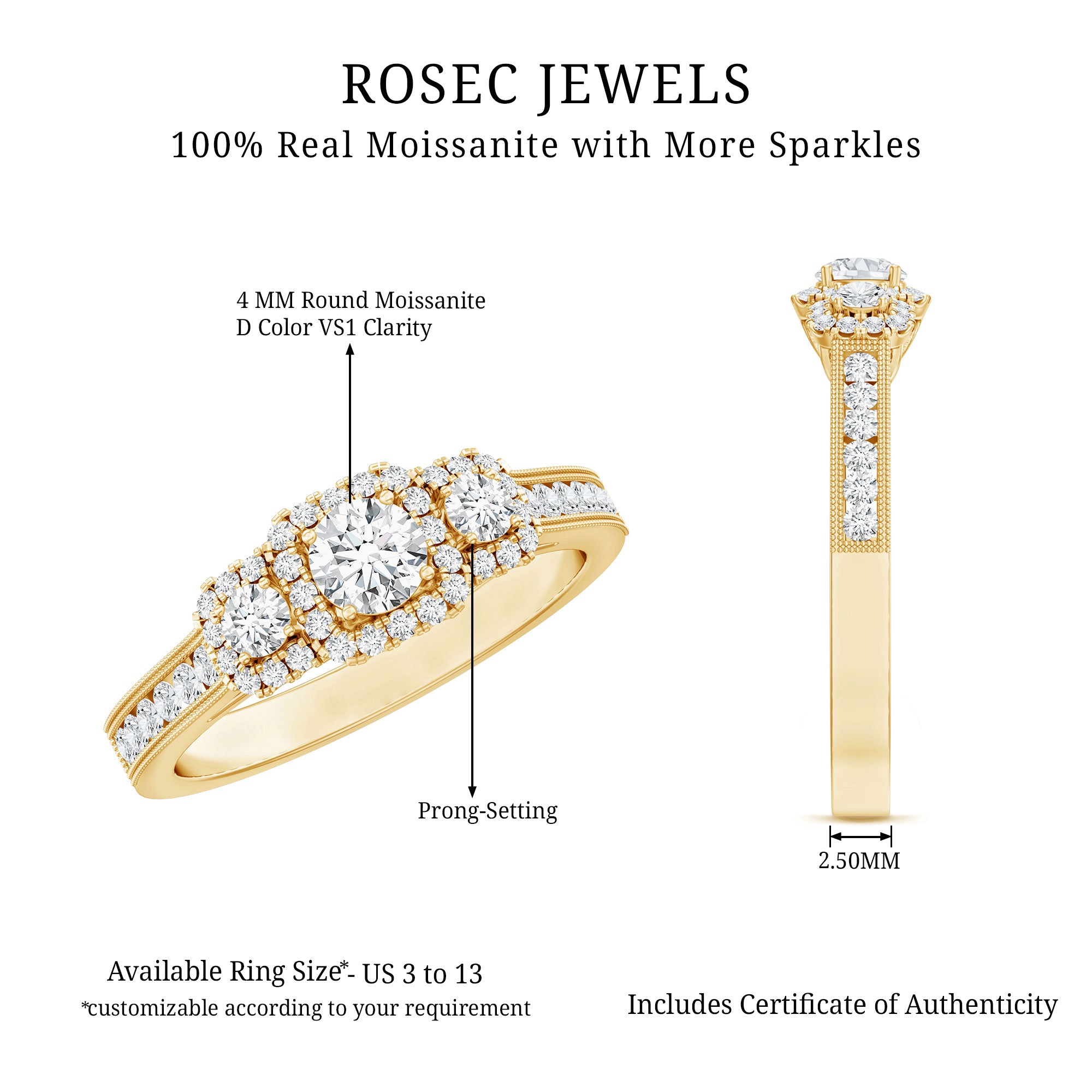 Our Moissanite Engagement Ring honors the Past, celebrates the Present, and shines for the Future. This Three Stone Engagement Ring is where vintage romance meets contemporary sparkle, a true tribute to timeless love and thoughtful design. Featuring three brilliant round cut Moissanite stones, each carefully chosen for its D color and VS1 clarity, and surrounded by smaller stones, the ring reflects your journey together. The trio of stones is delicately accented by dainty side gems that add extra shimmer without overpowering the meaningful centerpiece. Intricate beaded detailing along the band brings a vintage-inspired elegance, giving the 3 Stone Moissanite Ring a heirloom feel while the clean lines and modern craftsmanship ensure a fresh, unforgettable look. Crafted for the romantic who appreciates both tradition and individuality, this Past Present and Future Ring is more than just a symbol of love, it’s a reflection of shared values, deep connection, and lasting beauty. Whether youre preparing to propose or celebrating a milestone, this Vintage Engagement Ring is designed to make the moment magical. Presented in a beautiful jewelry box and available in a range of sizes, its ready to become part of your forever. Let this stunning piece be the sparkle that marks the beginning of your next chapter, full of love, meaning, and memories to come.
