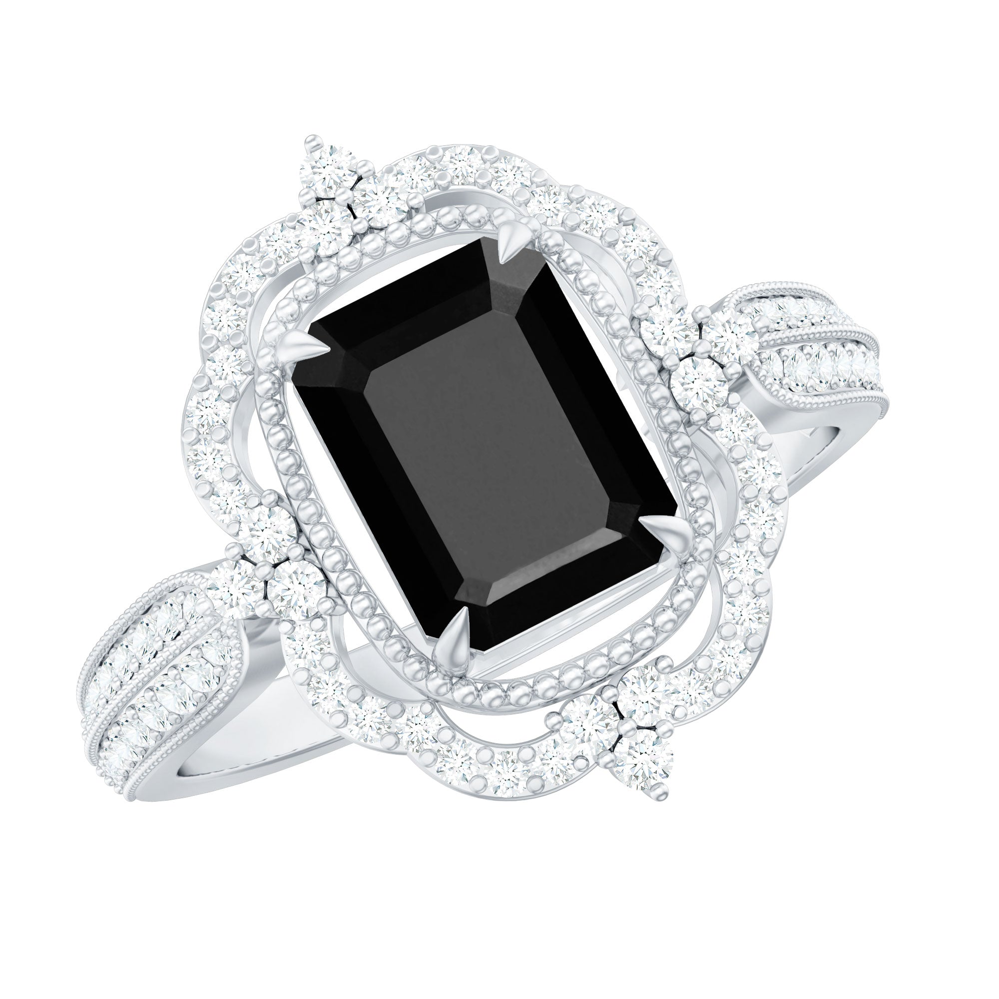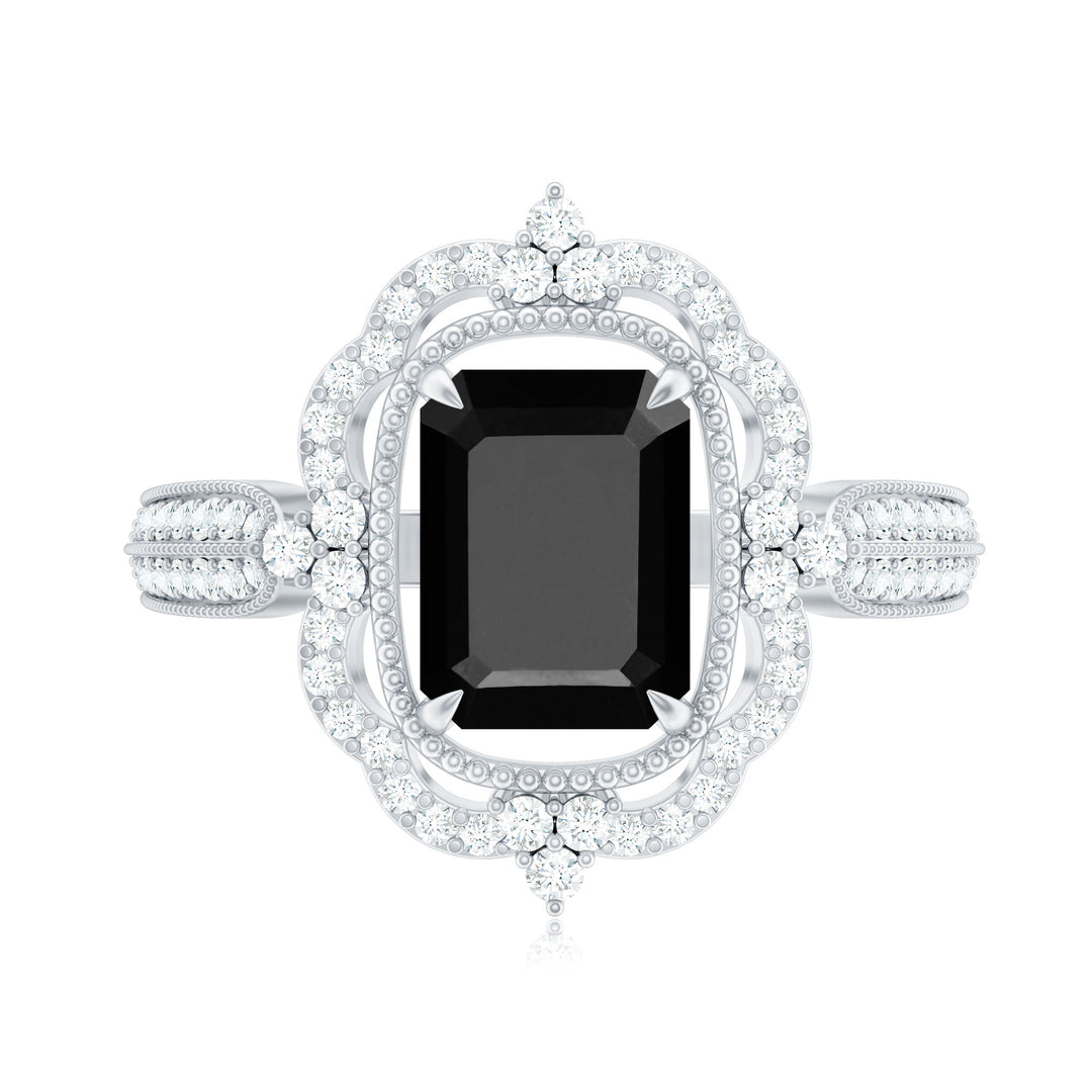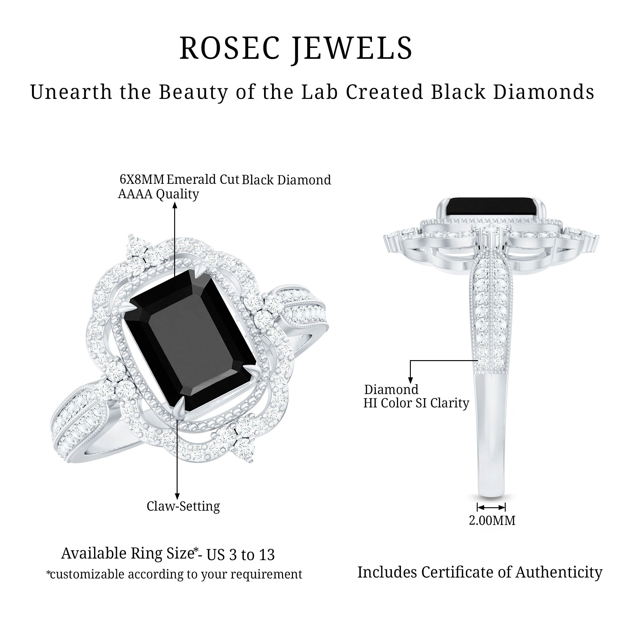 Vintage Style Octagon Created Black Diamond Floral Engagement Ring with Accent