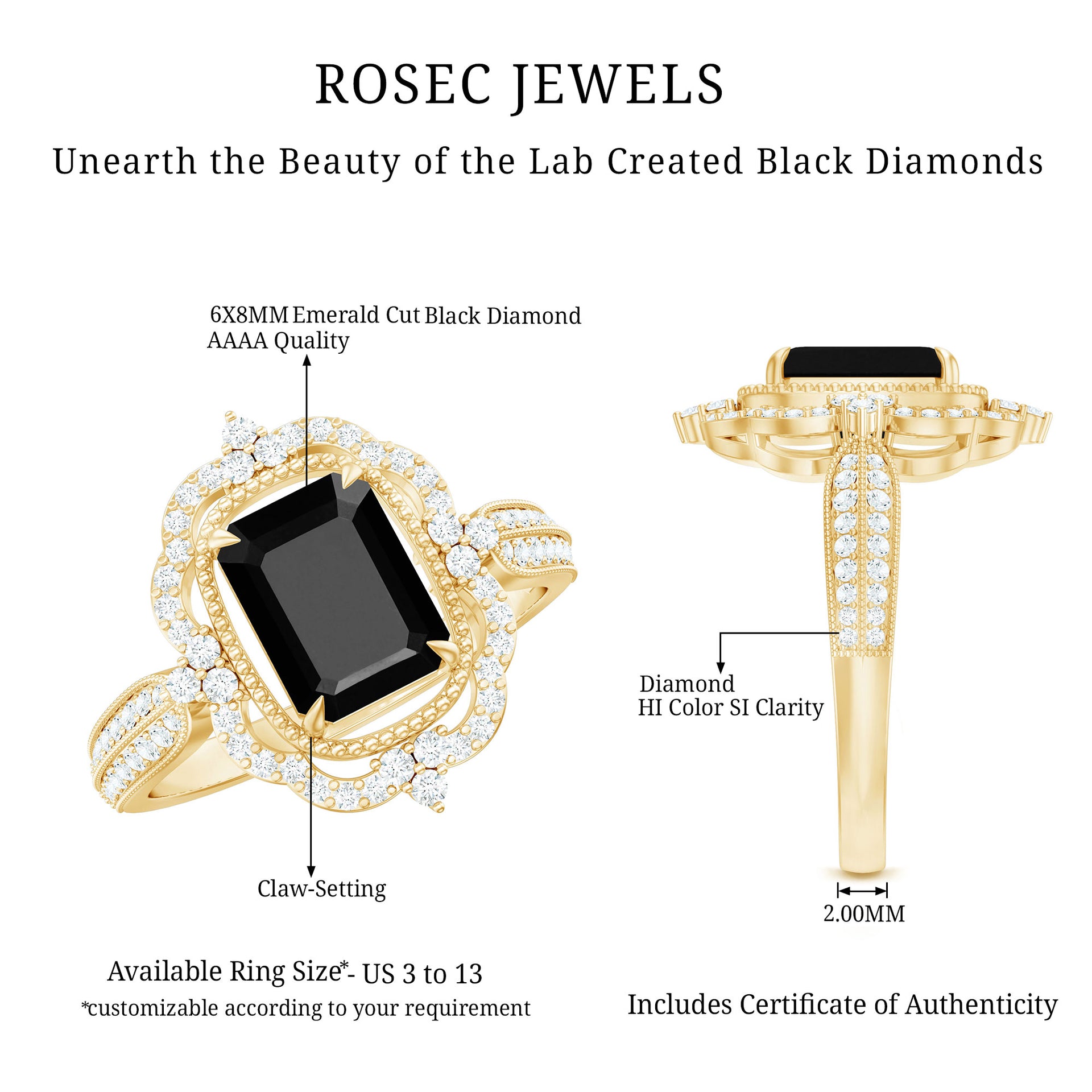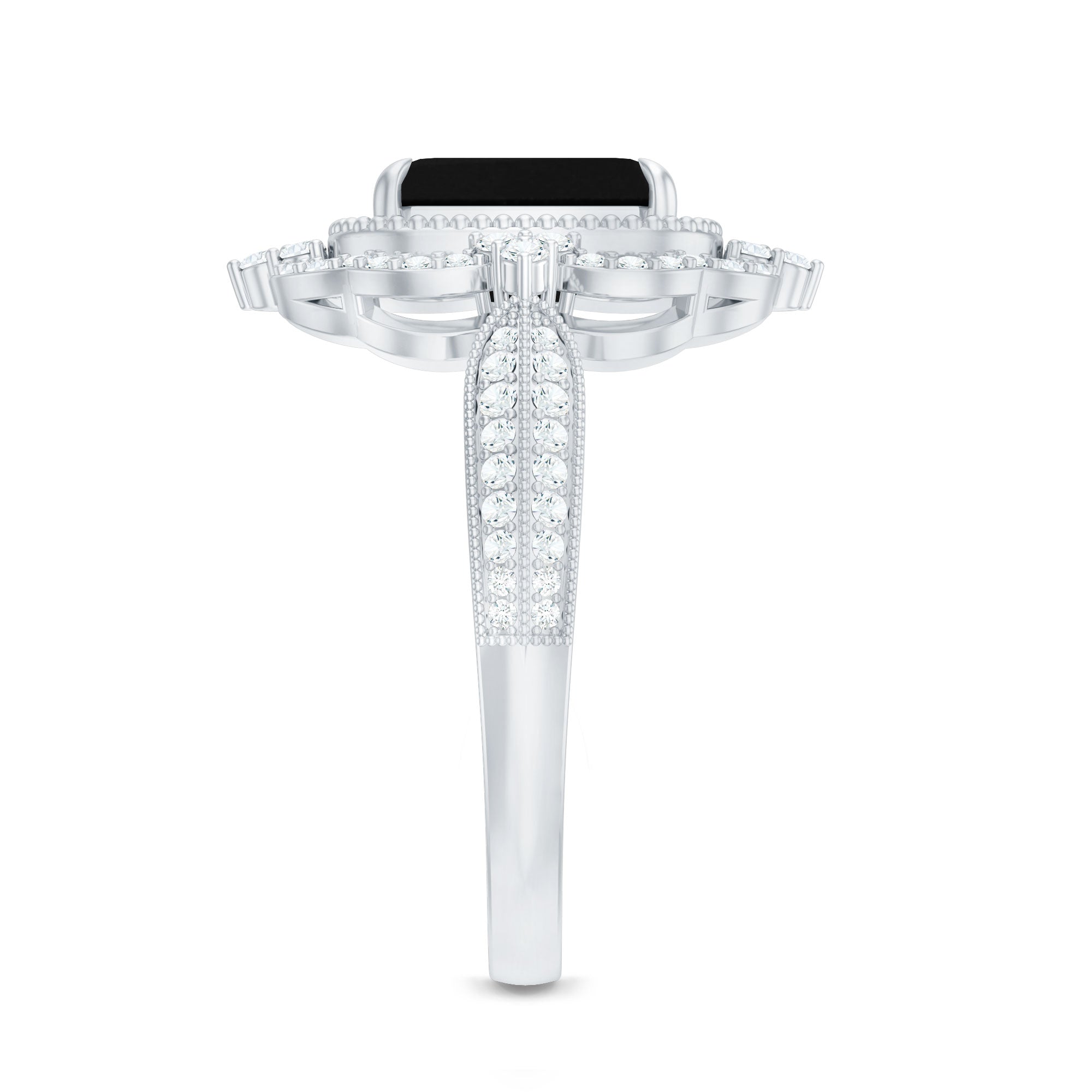 This exquisite Floral Engagement Ring is the perfect blend of old-world charm and contemporary elegance. The octagonal created Black Diamond, set at the center of a stunning floral design, is surrounded by sparkling round Diamond stones, creating a breathtaking and unique piece of jewelry. The vintage-inspired shank adds a touch of timeless elegance, making this ring the perfect symbol of love and commitment. Whether your looking for an engagement ring or a special piece of jewelry to mark a special occasion, this Created Black Diamond Ring is sure to become a cherished treasure.