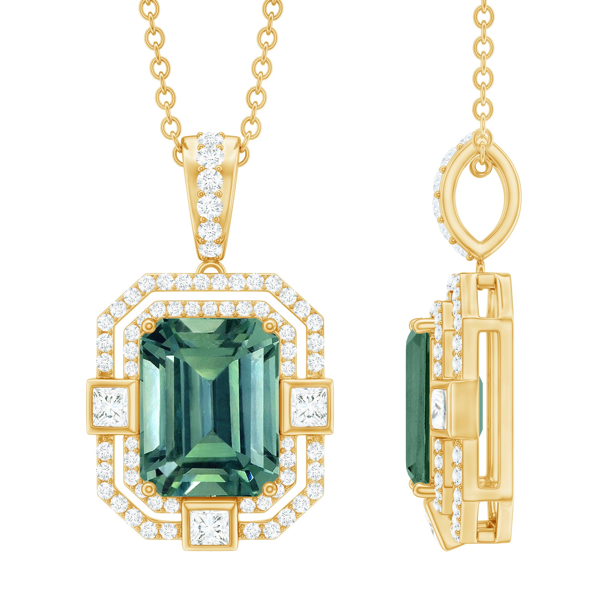 Emanating timeless charm, the Vintage-Inspired Pendant Necklace showcases a magnificent Octagon Shape Lab-Created Green Sapphire as its brilliant solitaire. Further enhanced by a captivating halo of Princess Cut and Round Cut Moissanite stones, exuding dazzling brilliance. With its stunning design, this necklace becomes a true expression of beauty, effortlessly elevating any look and leaving a lasting impression on all who behold it.