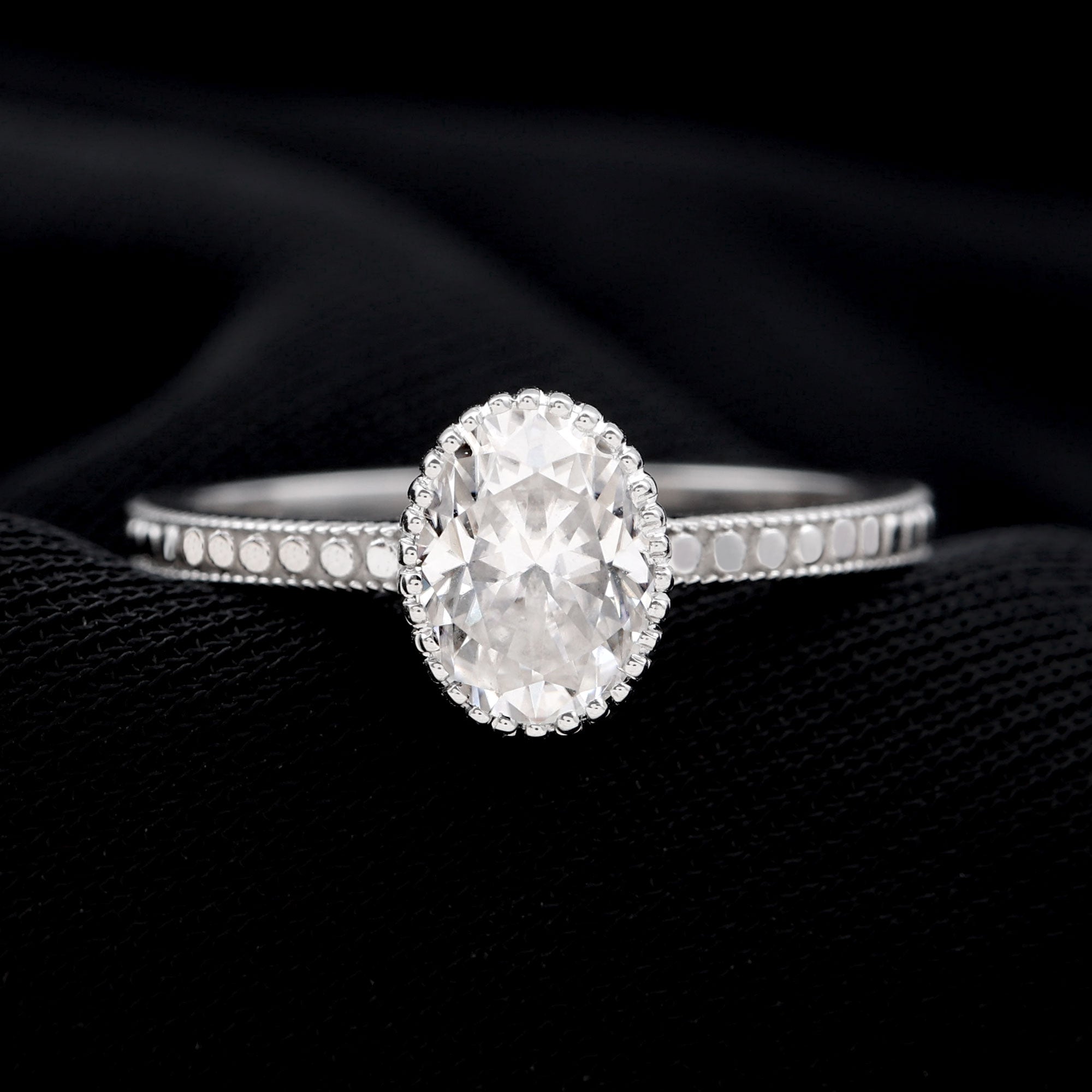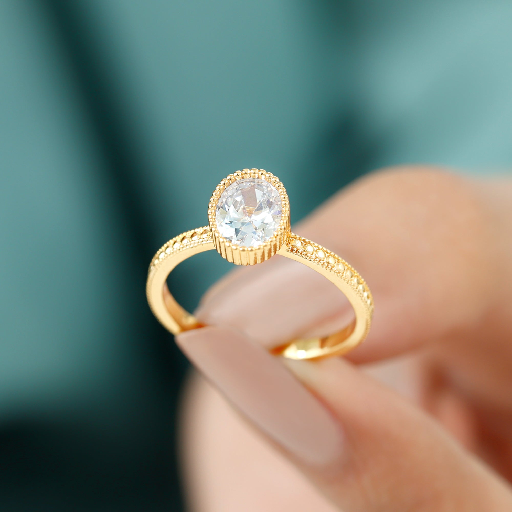 Behold this captivating Vintage Engagement Ring, featuring a brilliant Oval Shape Lab Grown Diamond delicately cradled within a bezel setting. The shank is exquisitely adorned with intricate beaded details, elevating its overall allure. This Solitaire Ring not only brings a touch of radiant elegance to your special occasion but also stands as a flawless choice for a proposal ring. Its timeless design and the dazzling Lab Grown Diamond make it a symbol of eternal love, promising a lifetime of shared moments and cherished memories.