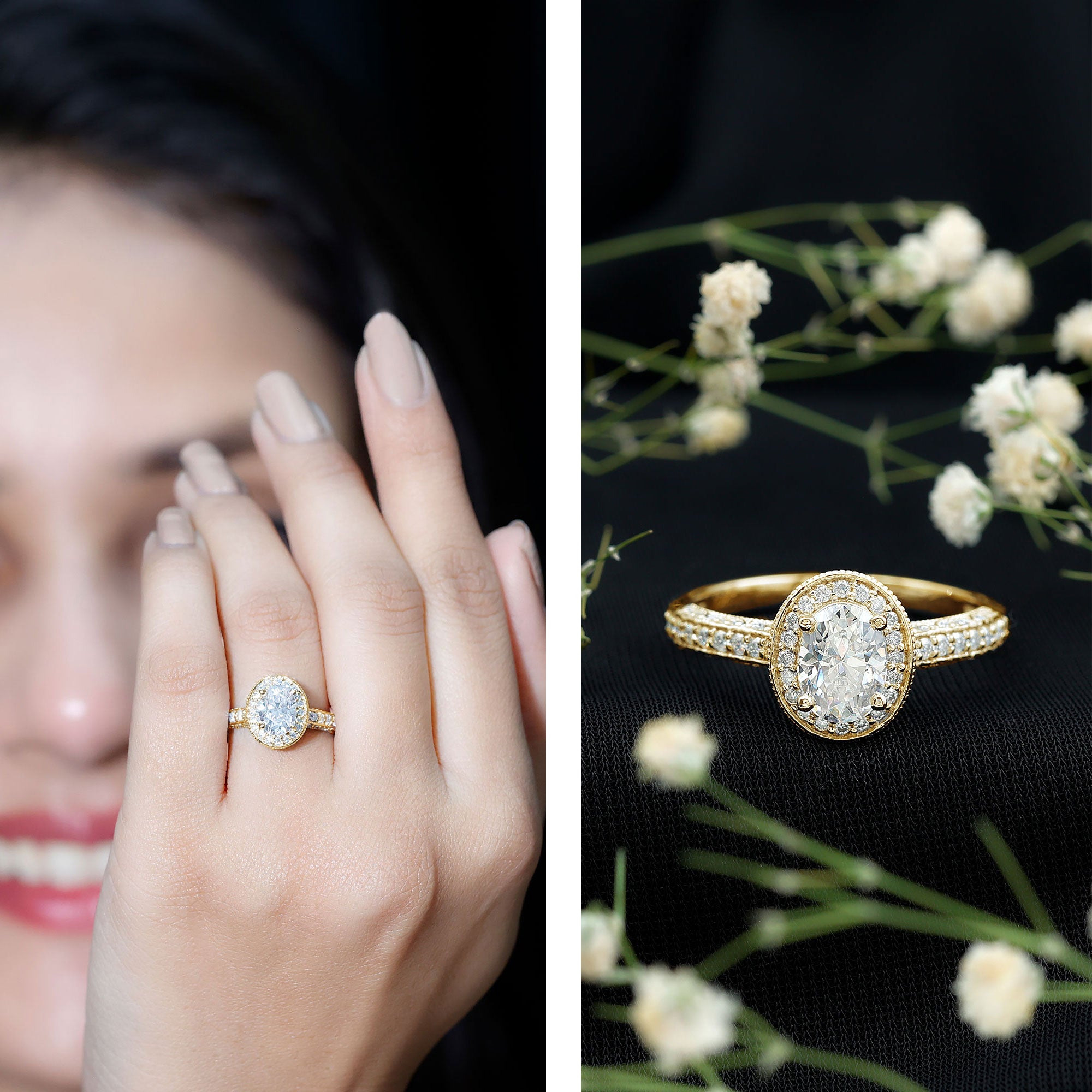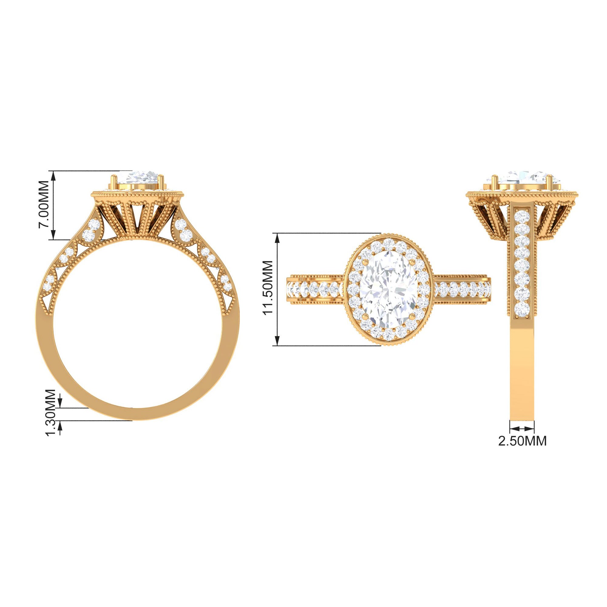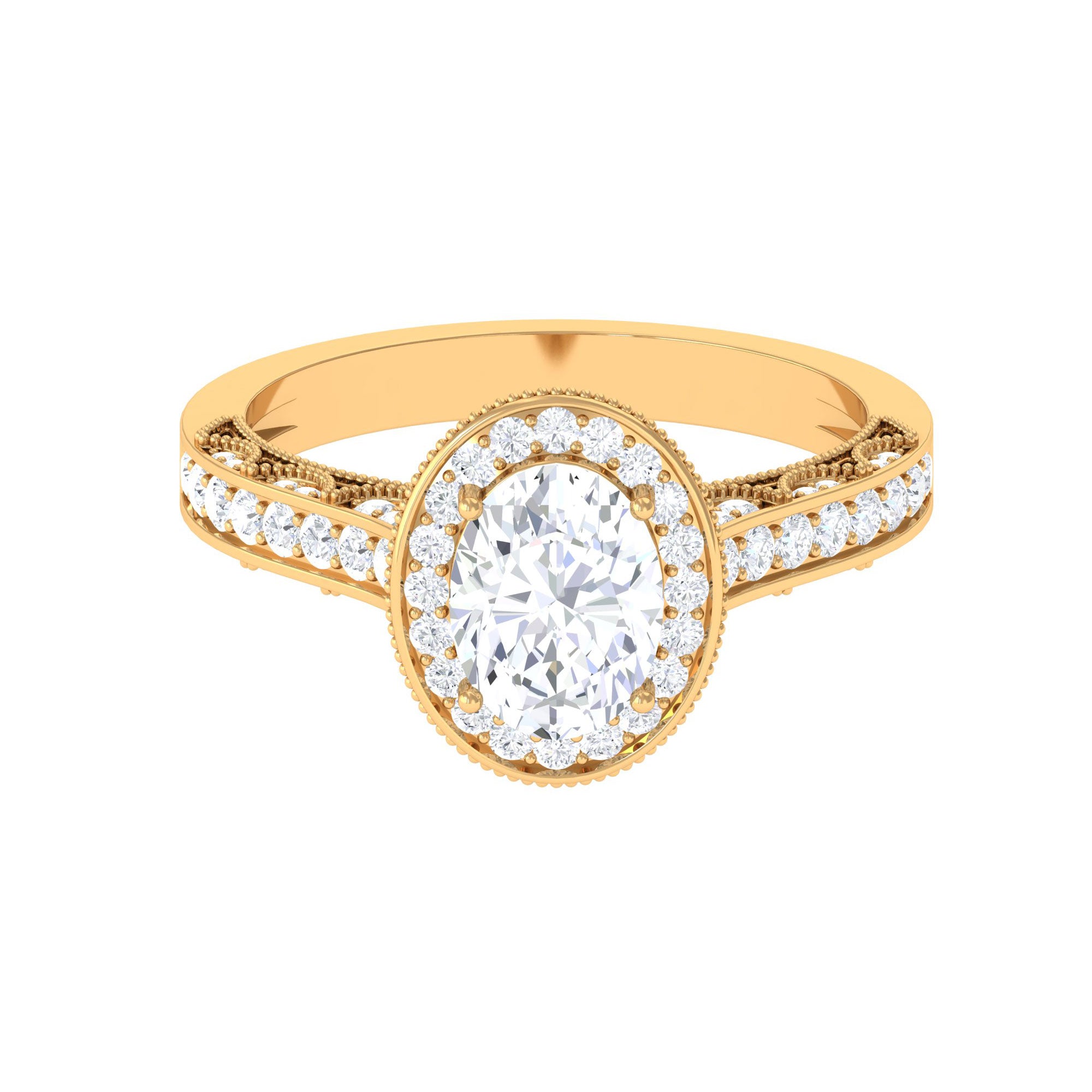 Make a commitment of togetherness to your beloved with this classic vintage-style engagement ring. Crafted from solid gold, the vintage ring features an elegant oval-shaped zircon in the center, surrounded by a halo and side stones, all perfectly complementing the crown shank design. The milgrain details on this engagement ring give it a distinct flair, adding to its already stunning appeal. This zircon gold engagement ring is a perfect way to show your love and affection to your special someone.