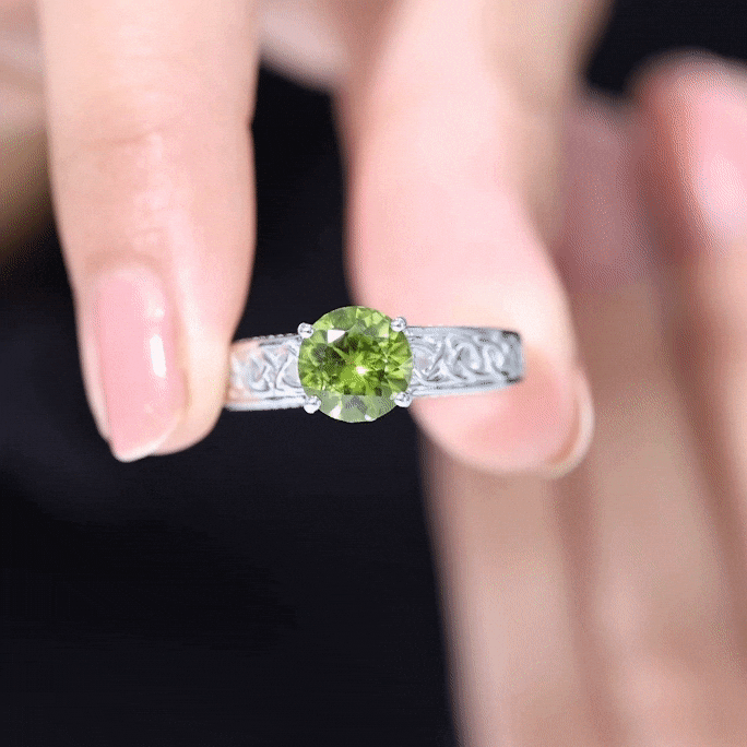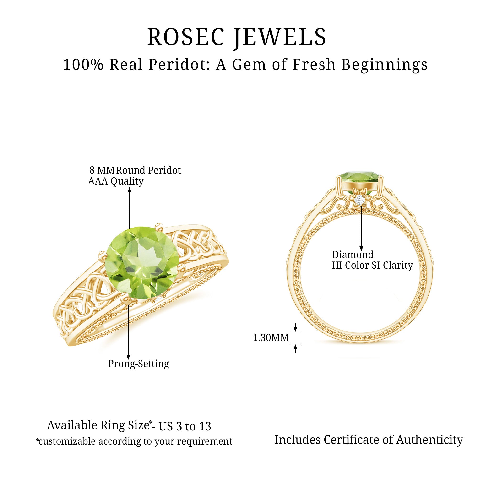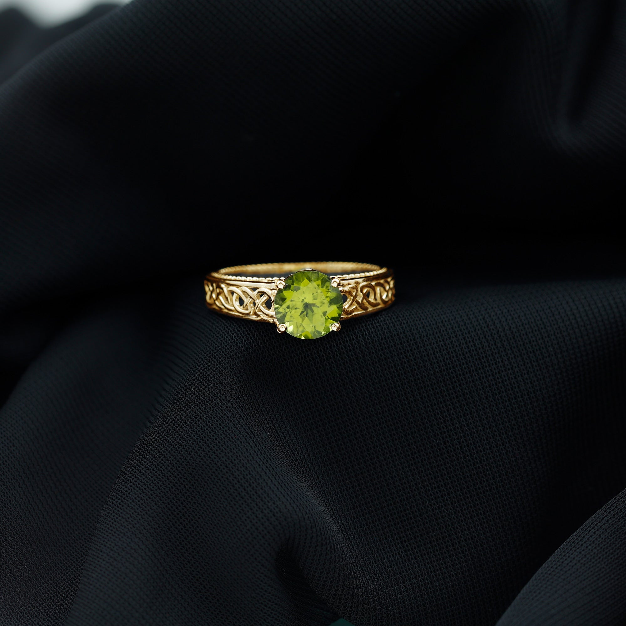 Symbolizing an unbreakable bond and a love written in destiny, this Vintage Looking Engagement Ring is rich with meaning and timeless beauty. At its center rests an 8 mm Round Shape Peridot set in Prong Setting, glowing with a fresh green sparkle that represents harmony, devotion and new beginnings. The band is adorned with an intricate Celtic Knot design, a powerful symbol of eternity and interconnected souls, wrapping the finger in a story that has no beginning and no end. Beneath the center stone, two dainty Diamond stones add a secret shimmer, a quiet reminder that true love always holds surprises. This thoughtful detail brings an intimate charm, making this Peridot Engagement Ring as personal as the promise it represents. Inspired by vintage artistry and crafted with modern precision, this Celtic Knot Engagement Ring with Peridot blends old-world romance with contemporary elegance. This Peridot Diamond Ring is designed for someone who values symbolism, craftsmanship and beauty that goes beyond the surface. Presented in a signature jewelry box and available in various ring sizes, this Solitaire Engagement Ring is ready to celebrate a love meant to last forever, told through every graceful detail.