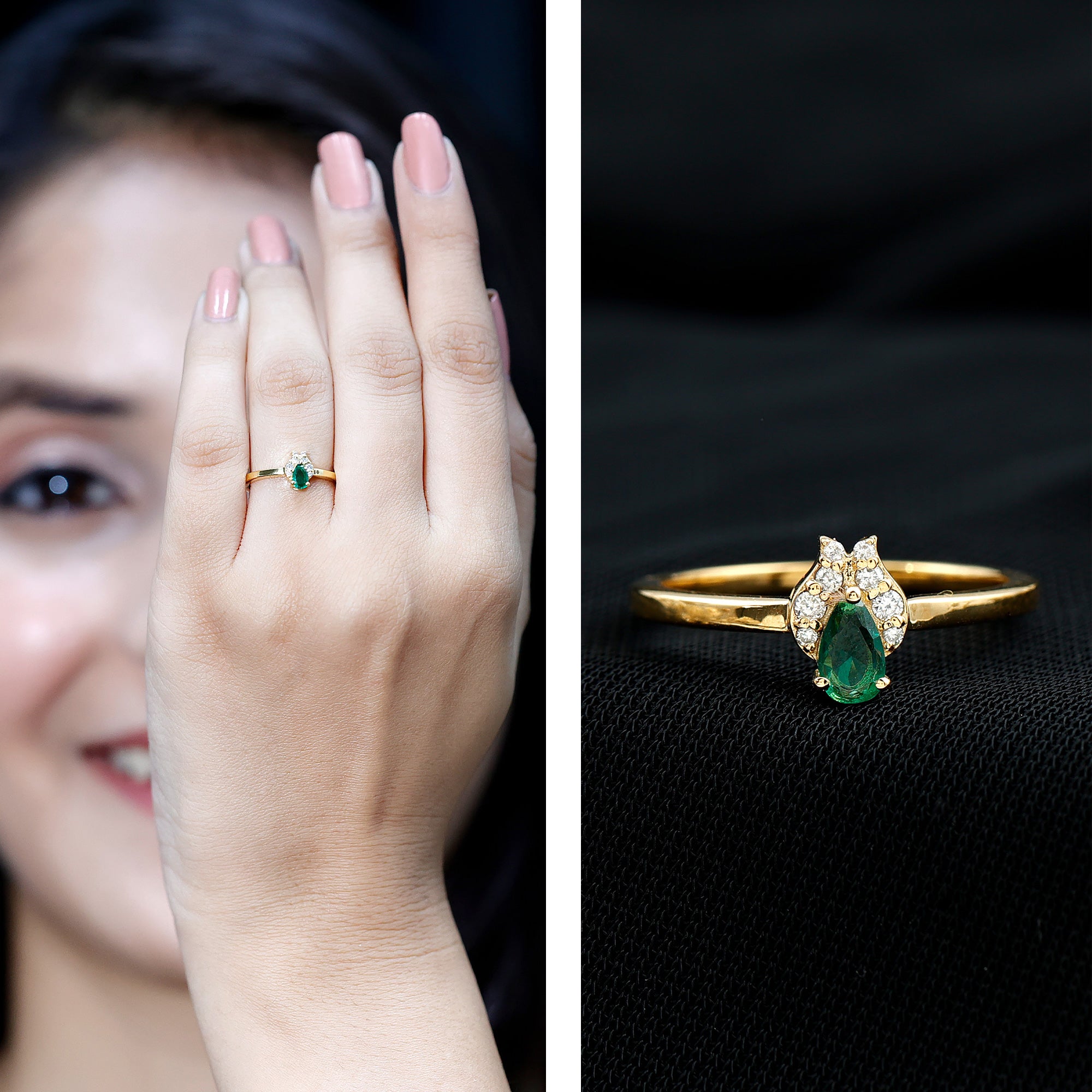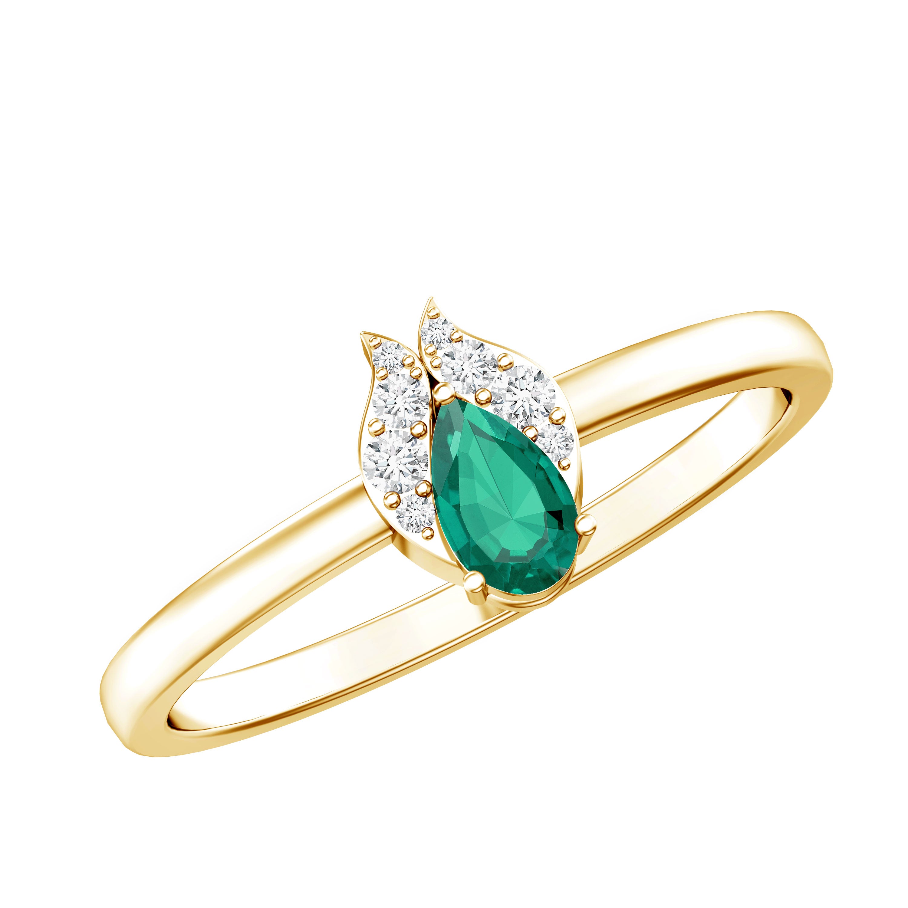 Your every promise shines more brightly with our Emerald Promise Ring, which is designed to capture the essence of love and commitment. Crafted in 14K yellow gold plated silver, this Minimalist Ring is designed for those who appreciate meaningful beauty and a touch of refined sophistication. At the center of this enchanting piece sits a 3X5 MM pear shaped lab created emerald, securely held in prong setting. Adding a delicate sparkle to the design are round lab grown diamonds, gracefully nestled in leaf-like motifs. The contrast between the vivid green and the brilliant white stone brings an air of quiet luxury, while the teardrop shape of the emerald adds a romantic charm. Sleek and slender, the band’s smooth finish complements the center stones perfectly, offering a minimal yet elegant look. The simplicity of the design ensures it remains versatile, ideal as a promise ring, a birthday gift, or a celebration of life’s milestones. Whether you are expressing a lifelong commitment or marking a special memory, this Emerald and Diamond Ring captures the depth of emotion in a soft, graceful way. With its symbolic color and timeless shape, it is a beautiful reminder of the love you share, and a piece to treasure forever. Packaged in a premium jewelry box and accompanied by a certificate of authenticity, this Commitment Ring is a heartfelt gift that speaks volumes with its understated beauty and elegance.