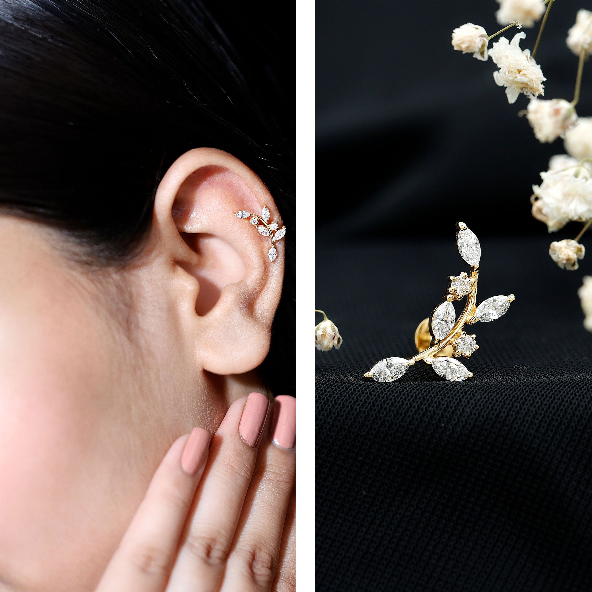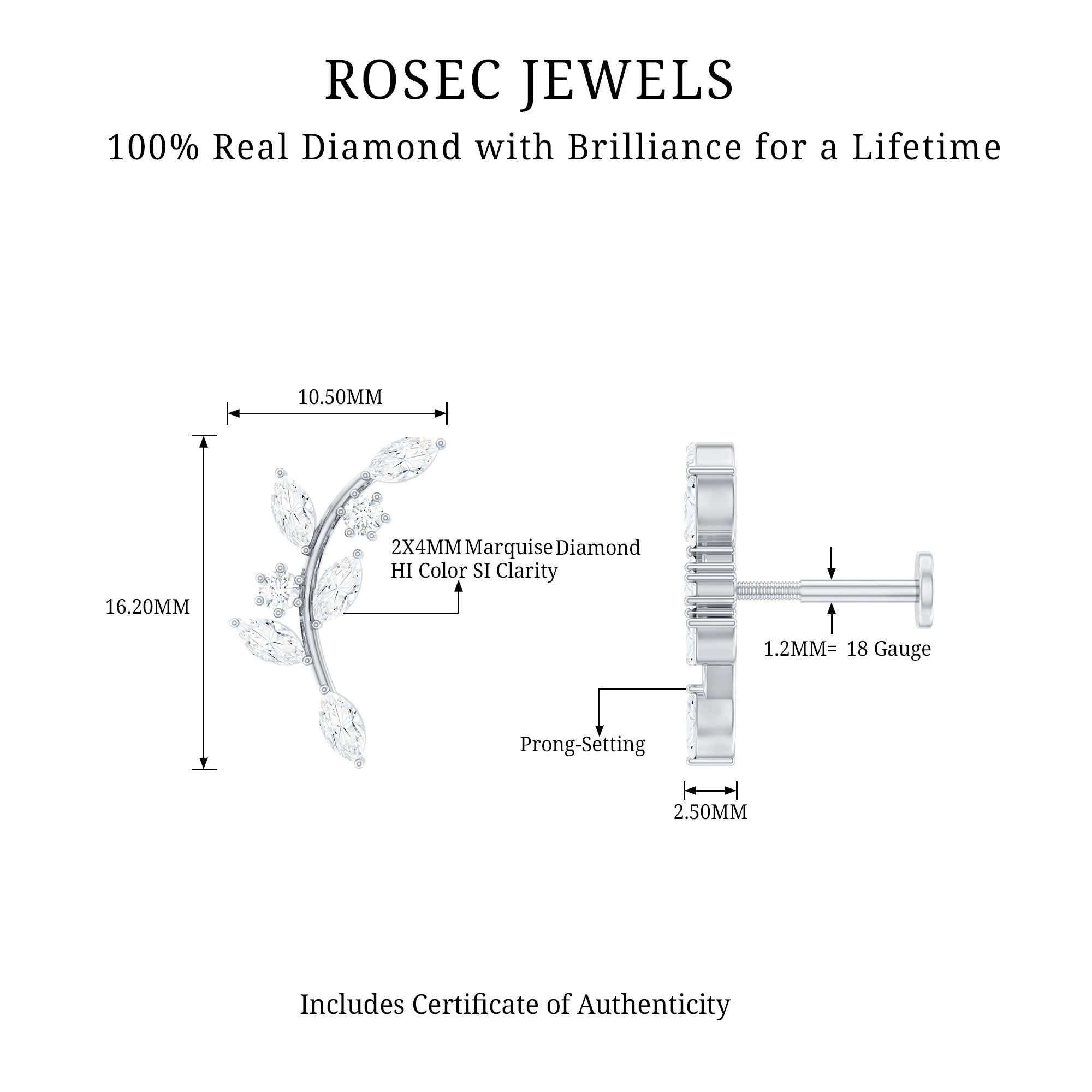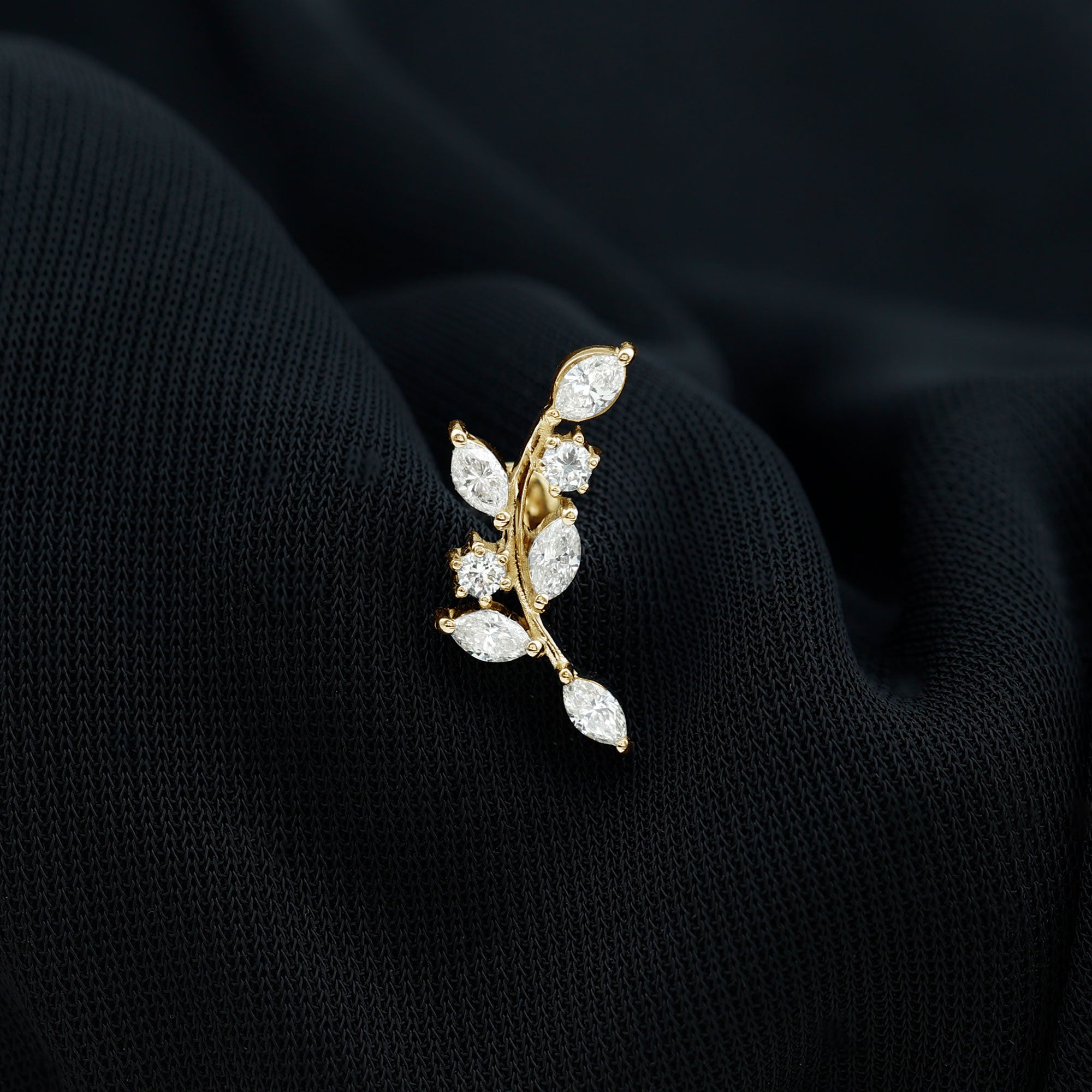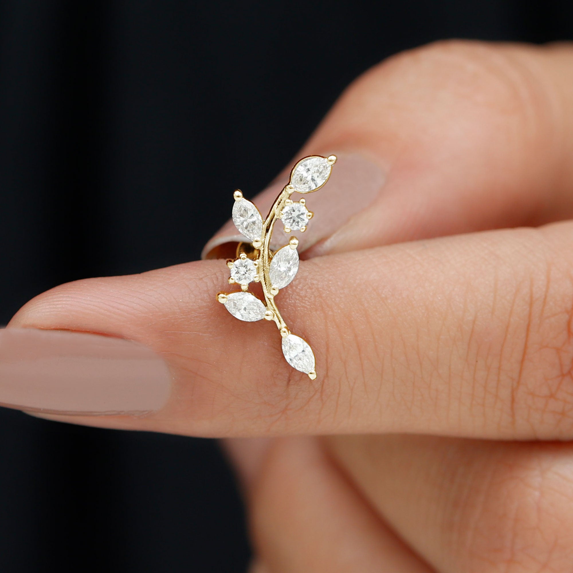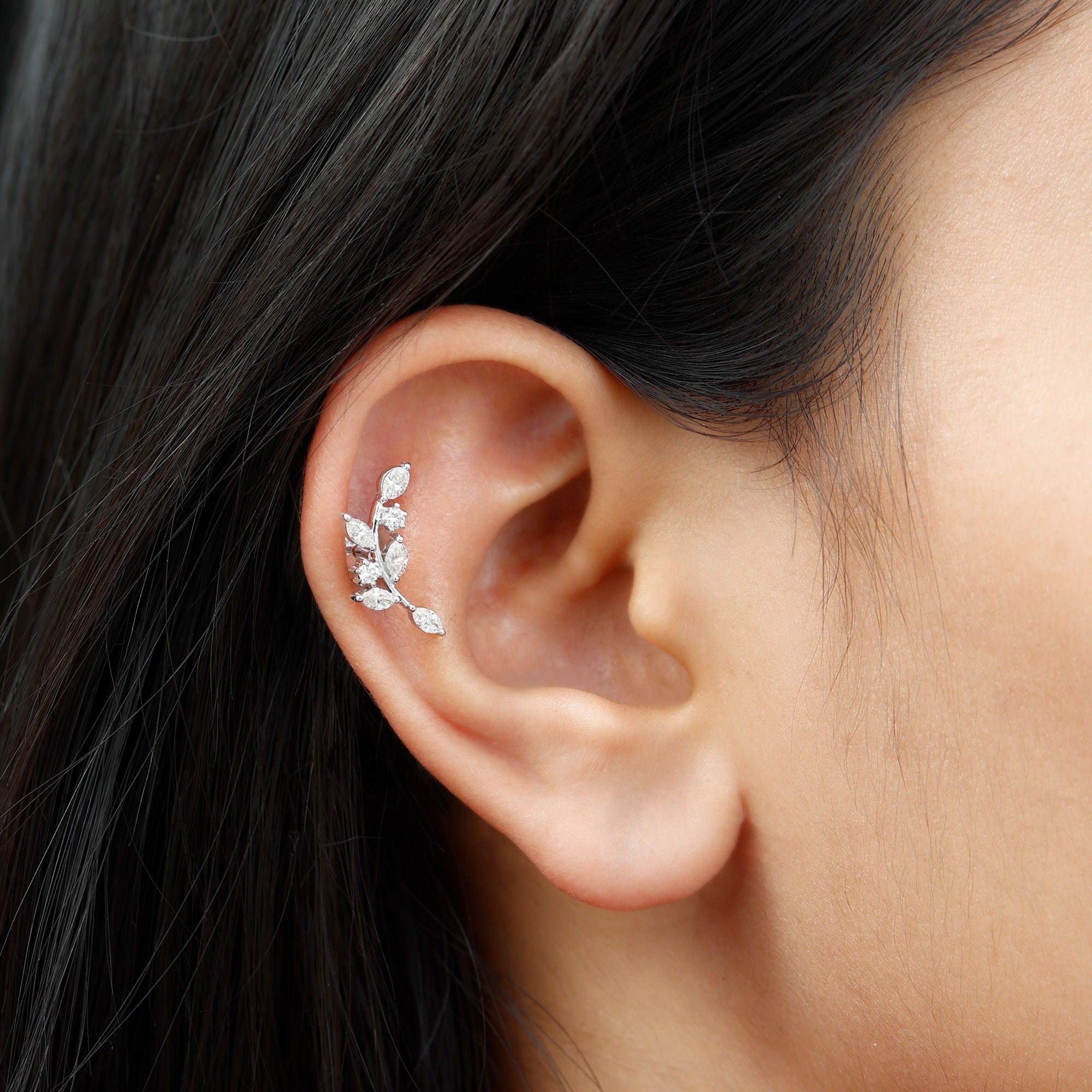 Ear Crawler is the easiest way to look effortlessly stylish! This earring features marquise diamonds resembling as sparkling leaves. Made in responsibly hallmarked metal for everyday wear. You can style this diamond leaf earring on your helix or cartilage piercing, as the flat back closure will keep it intact in place. Designed to be worn up and around the ear, making it easy to wear and perfect to rock from day to night. To create a fashion-savvy look, pair this climber earring with gemstone studs or drops. This item is also an ideal gift for birthdays, anniversaries, or romantic surprises, elegantly celebrating the most cherished moments in life. It is offered in a range of metal color choices and comes in various metal types as well. The Piercing Stud includes a certificate of authenticity for the gemstones and is beautifully packaged in a high-quality storage box.