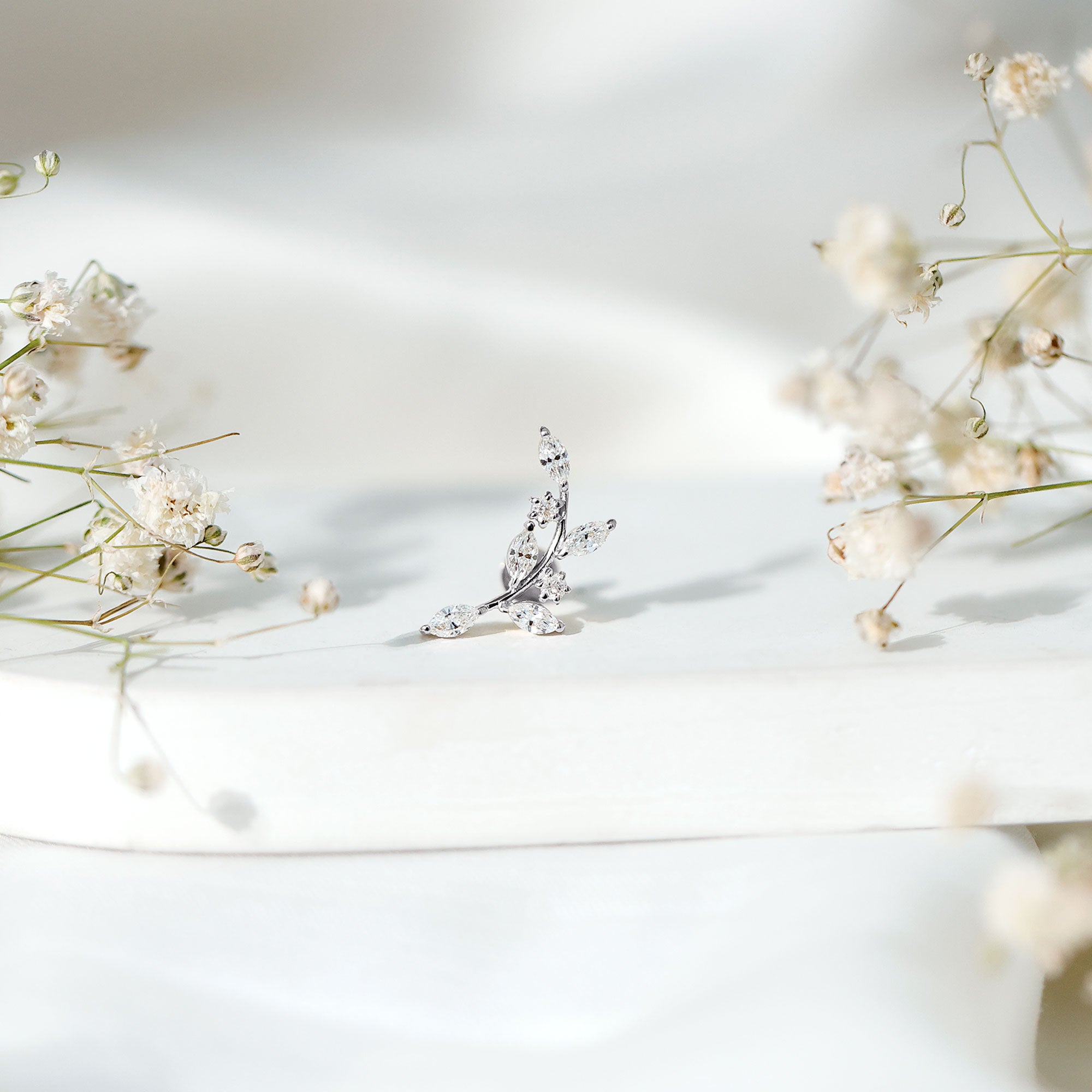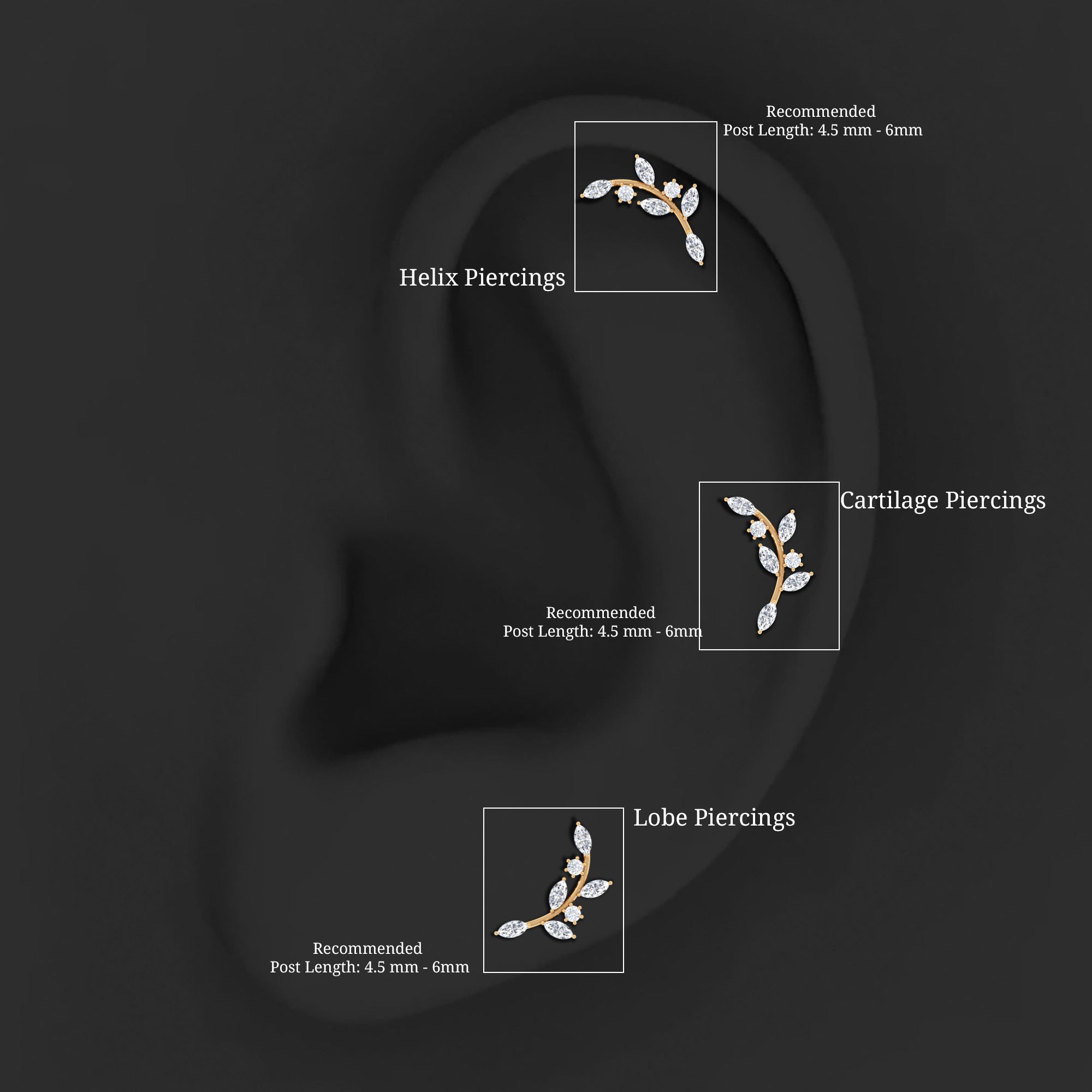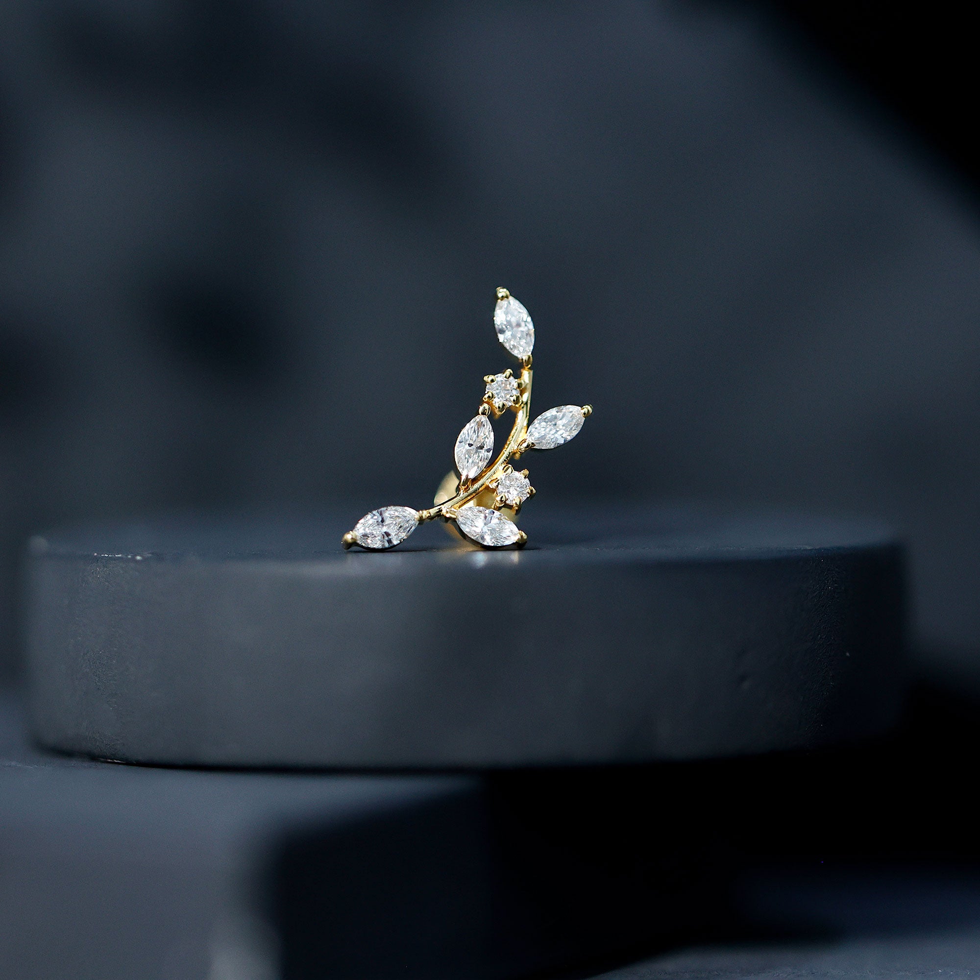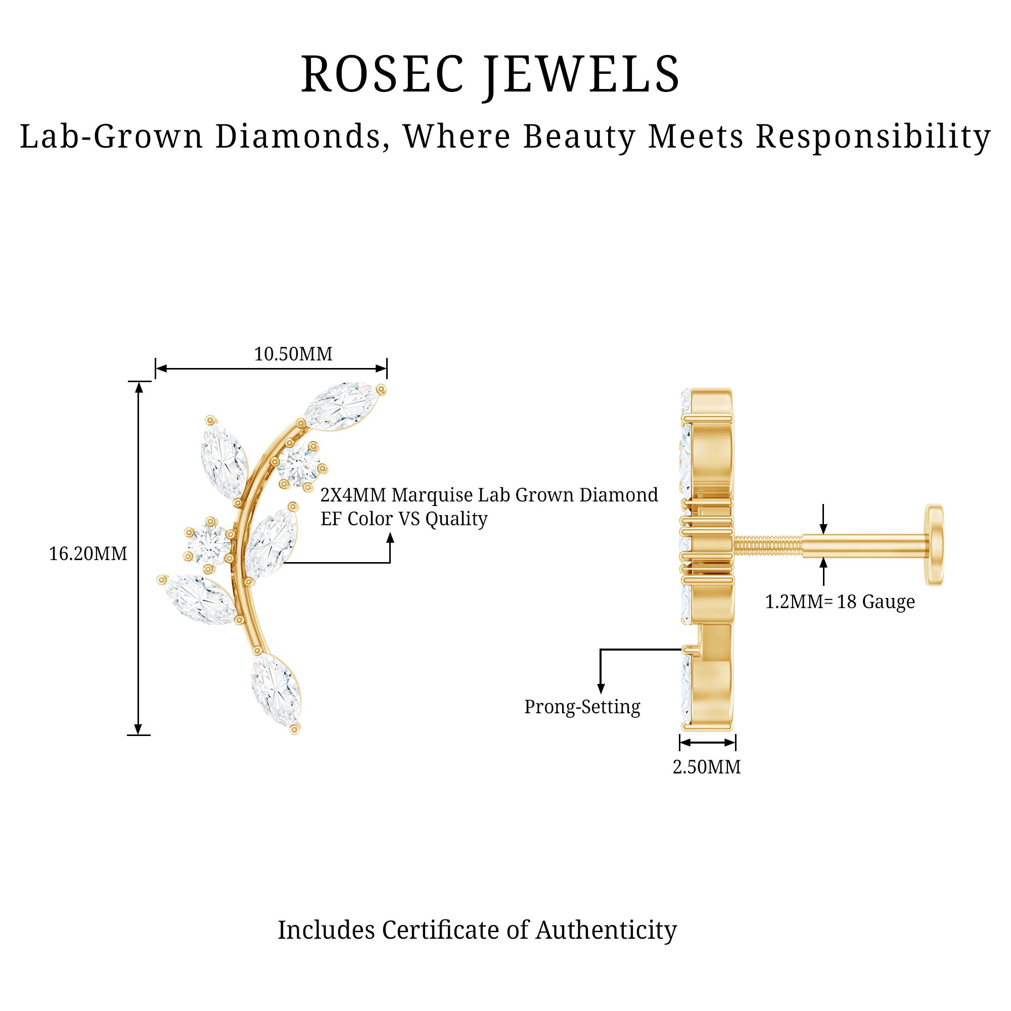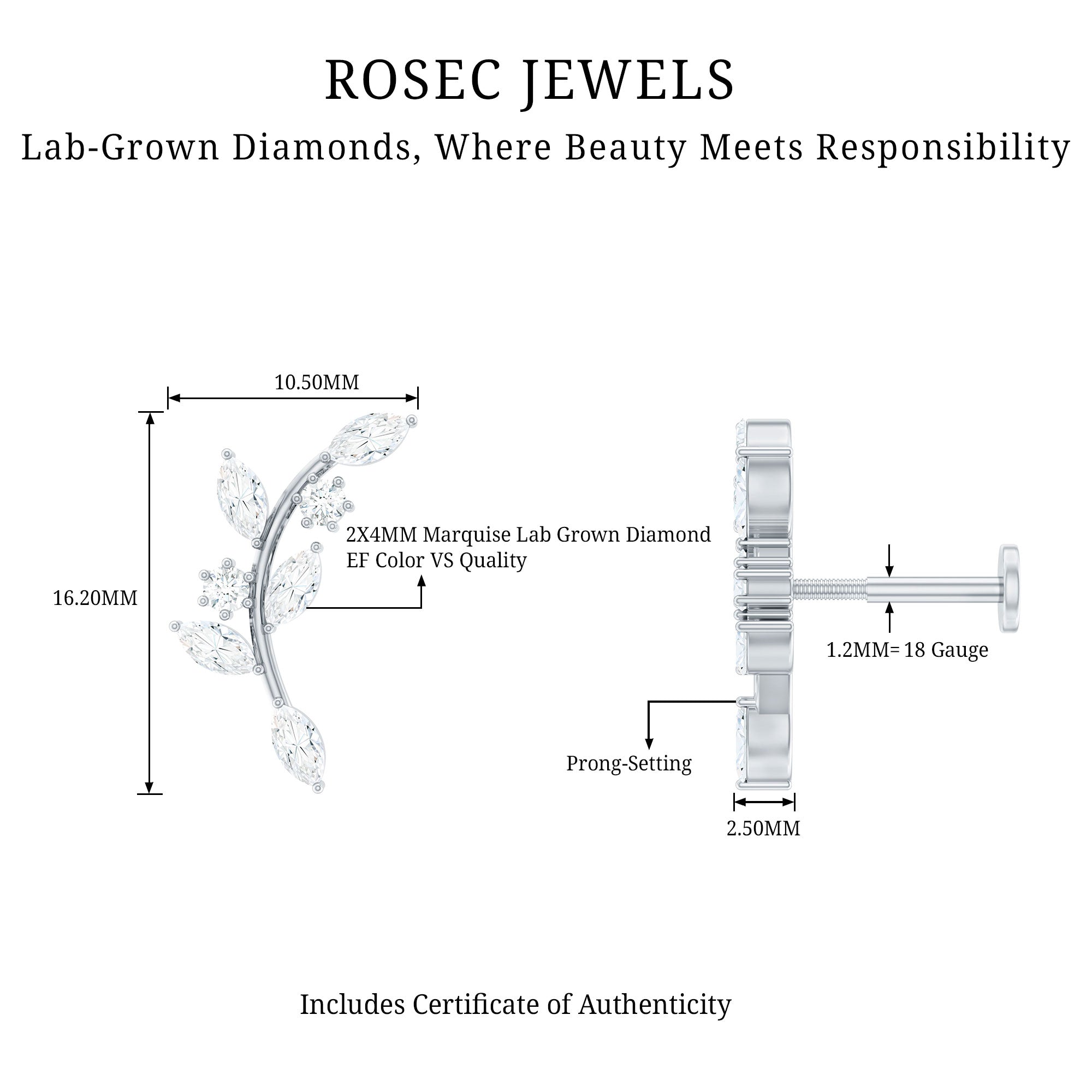 Ear Crawler is the easiest way to look effortlessly stylish! This earring features marquise diamonds resembling as sparkling leaves. Made in responsibly hallmarked metal for everyday wear. You can style this diamond leaf earring on your helix or cartilage piercing, as the flat back closure will keep it intact in place. Designed to be worn up and around the ear, making it easy to wear and perfect to rock from day to night. To create a fashion-savvy look, pair this climber earring with gemstone studs or drops. This item is also an ideal gift for birthdays, anniversaries, or romantic surprises, elegantly celebrating the most cherished moments in life. It is offered in a range of metal color choices and comes in various metal types as well. The Piercing Stud includes a certificate of authenticity for the gemstones and is beautifully packaged in a high-quality storage box.