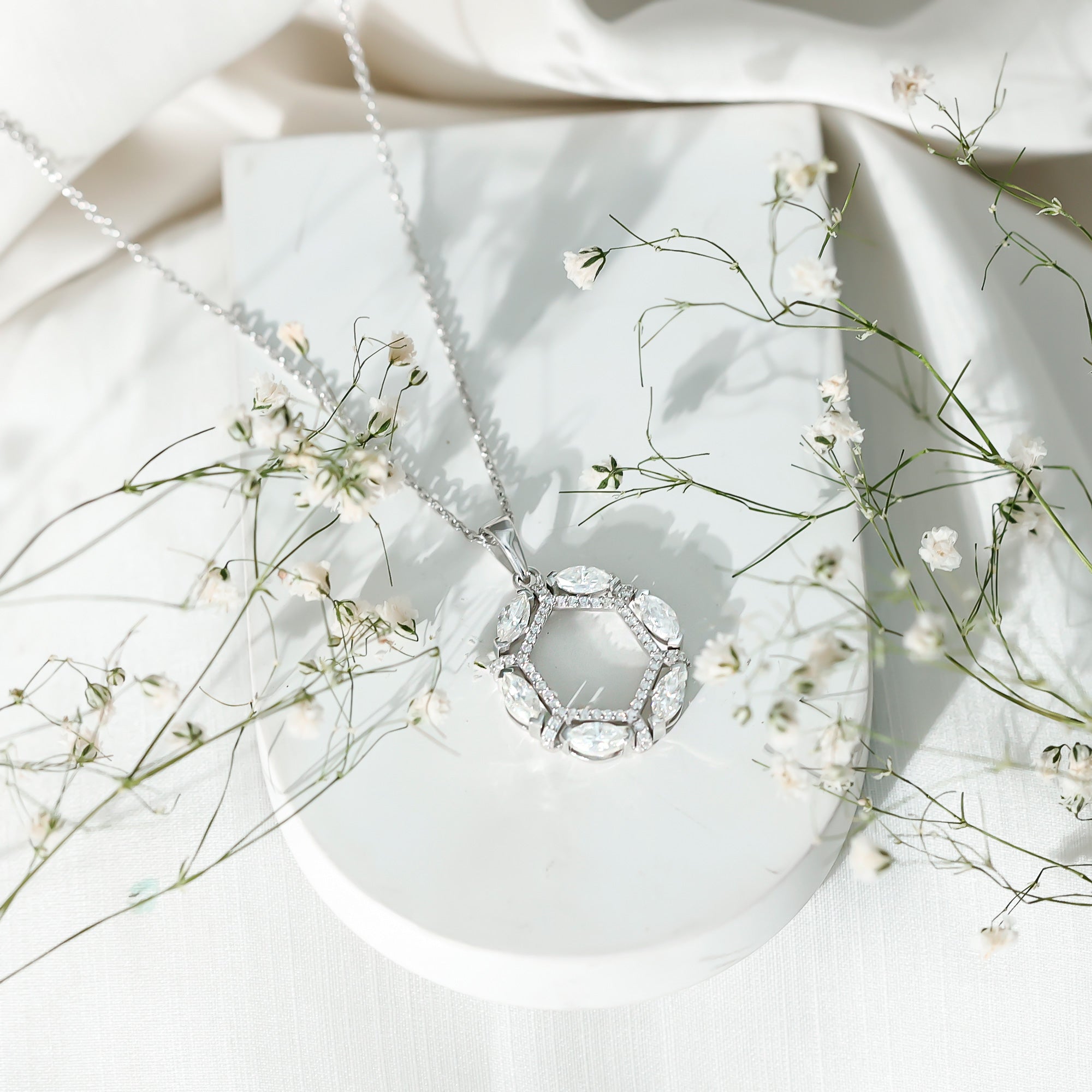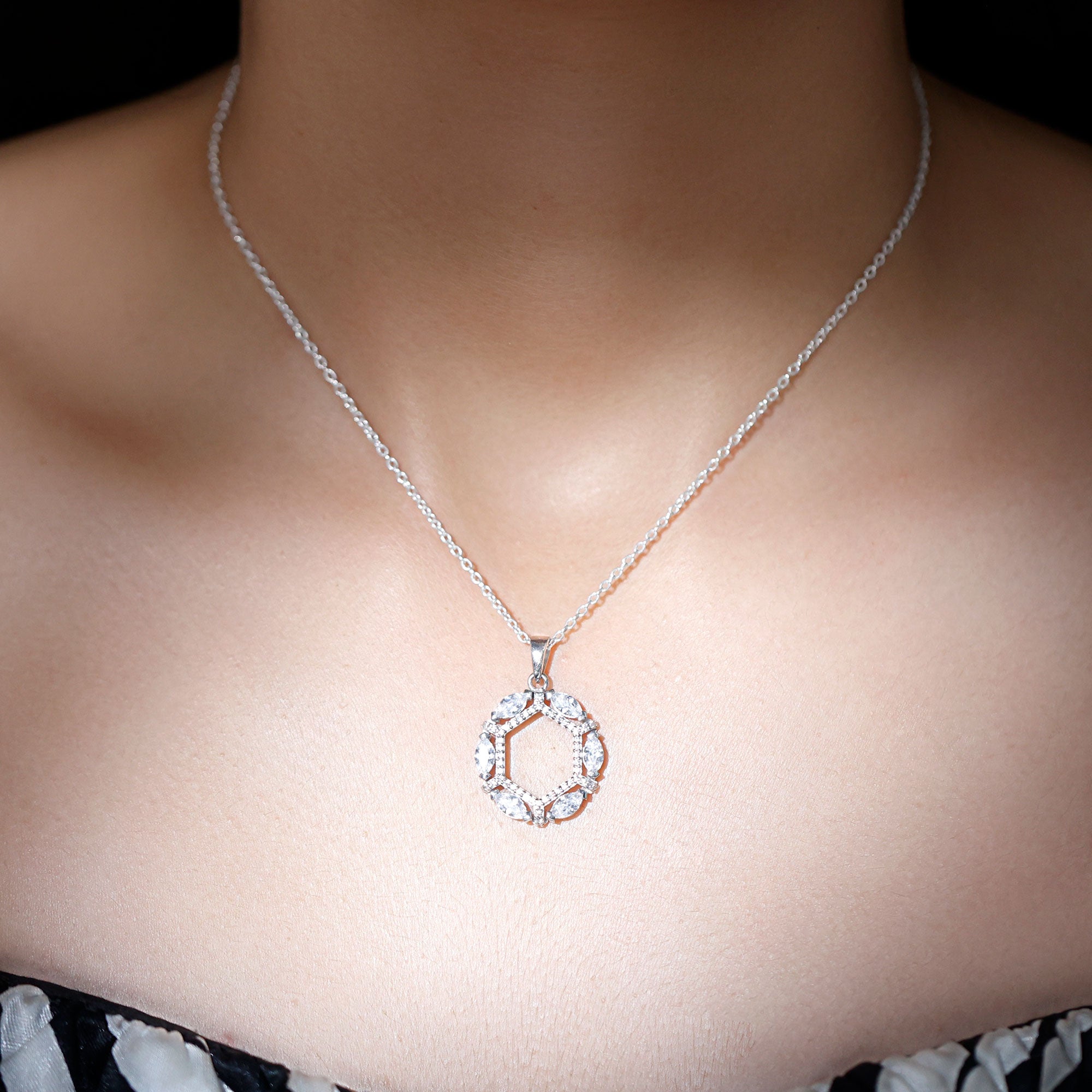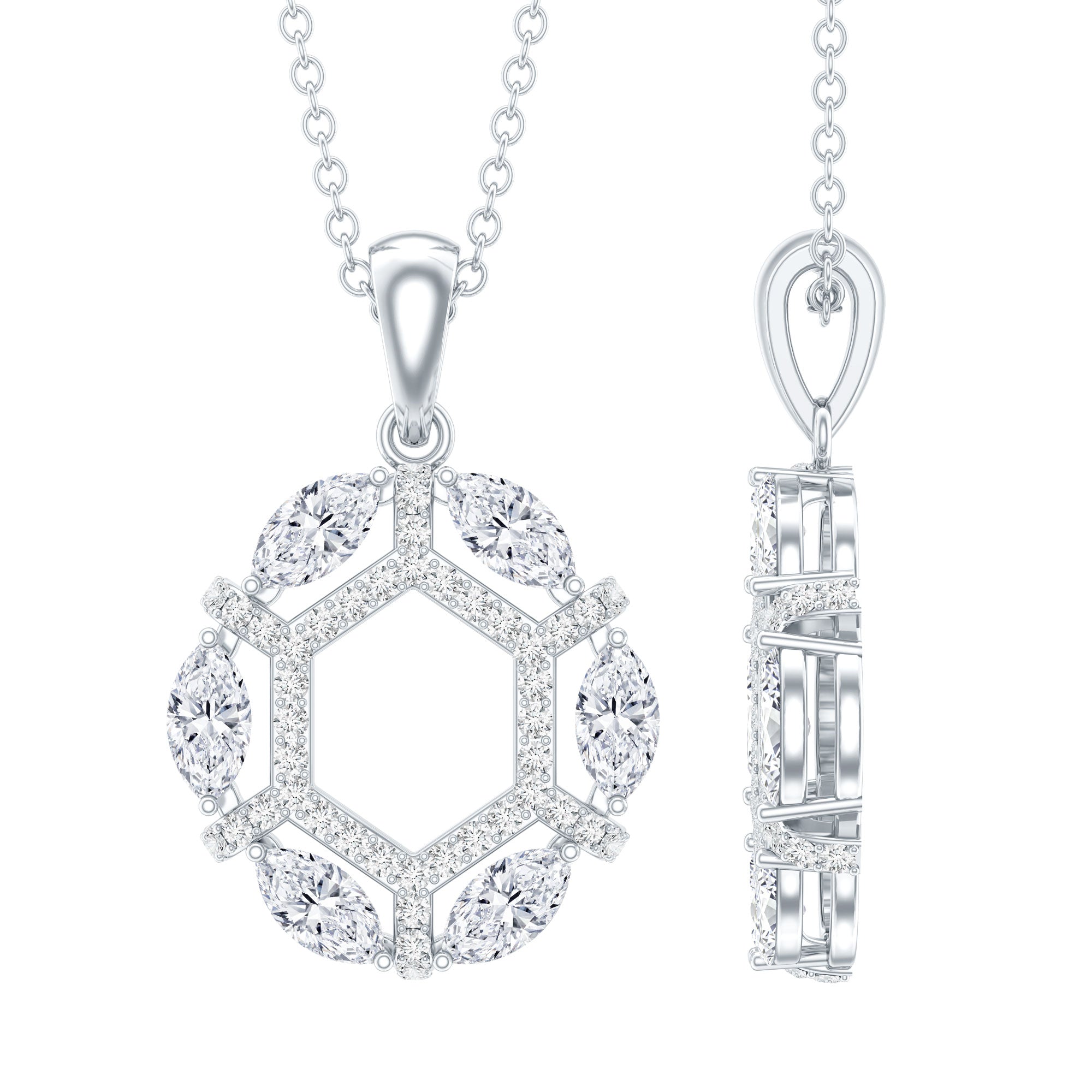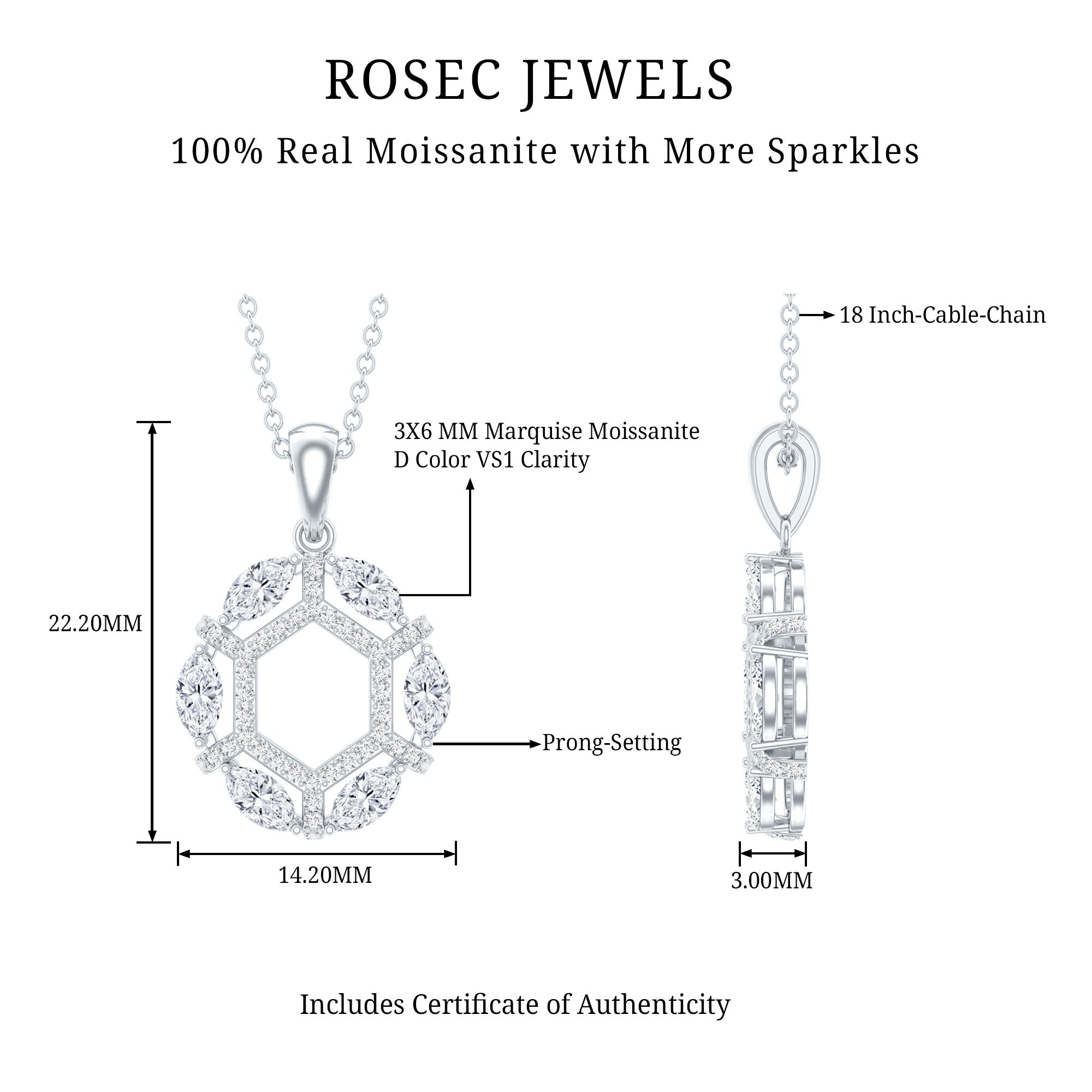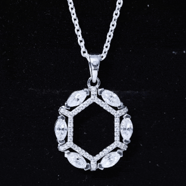 This Moissanite Pendant is the epitome of radiance and elegance, which highlights the neckline. It features an open Hexagonal frame studded with smaller round Moissanite and encircled by the Marquise Shape Moissanite securely placed in Prong Setting and precisely crafted with 14K White Gold Plated Silver. This Designer Pendant is accentuated with a standard bail and holds the classic shine of D-VS1 Quality Moissanite, which makes it perfect to complete the look for the special day. The pendant hangs with the sturdy cable chain, which makes it perfectly sit on the neckline. Perfect for adding a hint of elegance and charm to any ensemble, this Open Necklace makes a wonderful gift for someone special or a delightful treat for yourself. Whether worn by itself or combined with other accessories, this Eternity Necklace is guaranteed to shine and make you feel genuinely luxurious. Whether you are off to the office, enjoying a casual brunch, or heading out for a night on the town, this piece will seamlessly enhance any outfit. It arrives beautifully packaged in a jewelry box along with a certificate of authenticity, ensuring a reliable shopping experience with us.