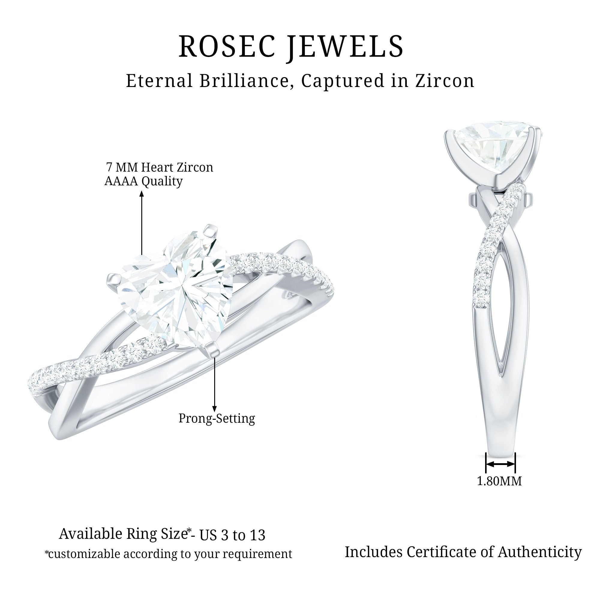 The Heart Shape Zircon in 3 Prong Setting with Crossover shank makes it an alluring piece of jewelry for you. Express your love with this Heart Ring.