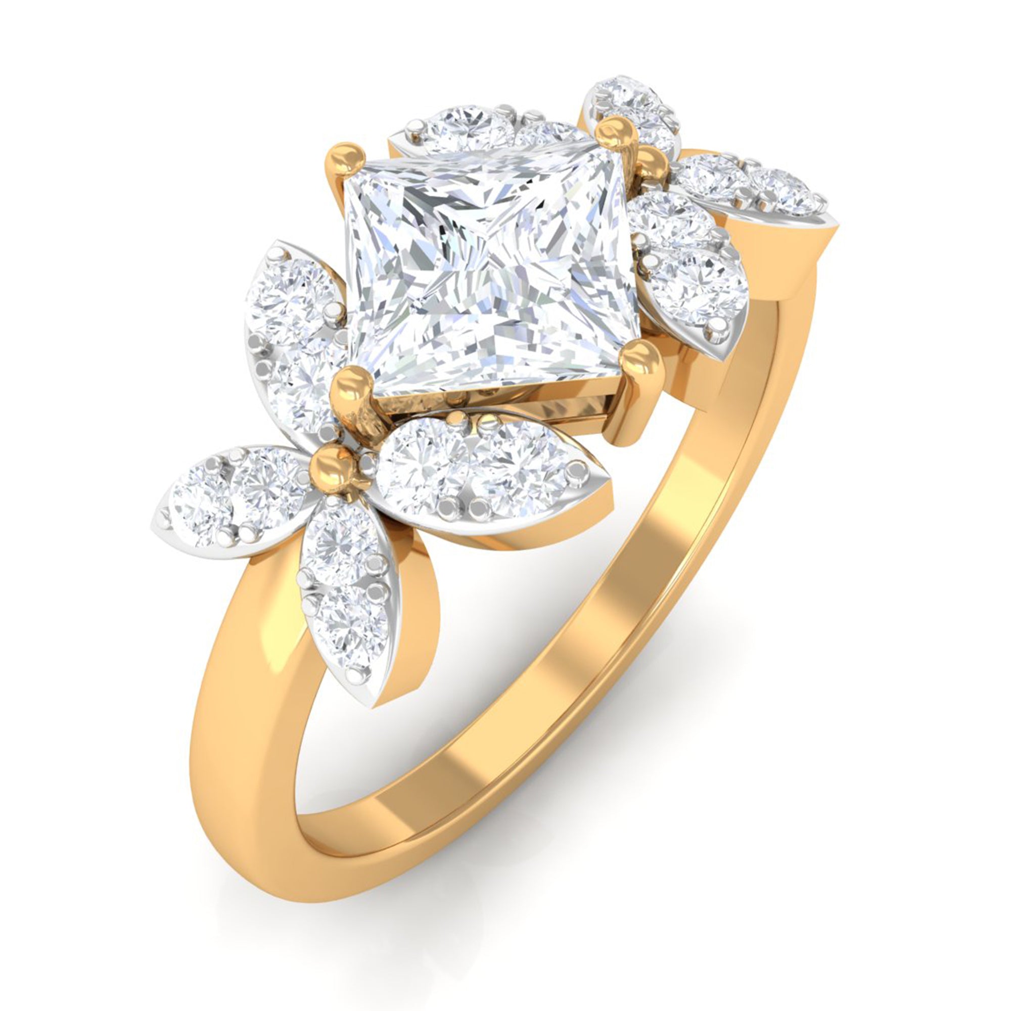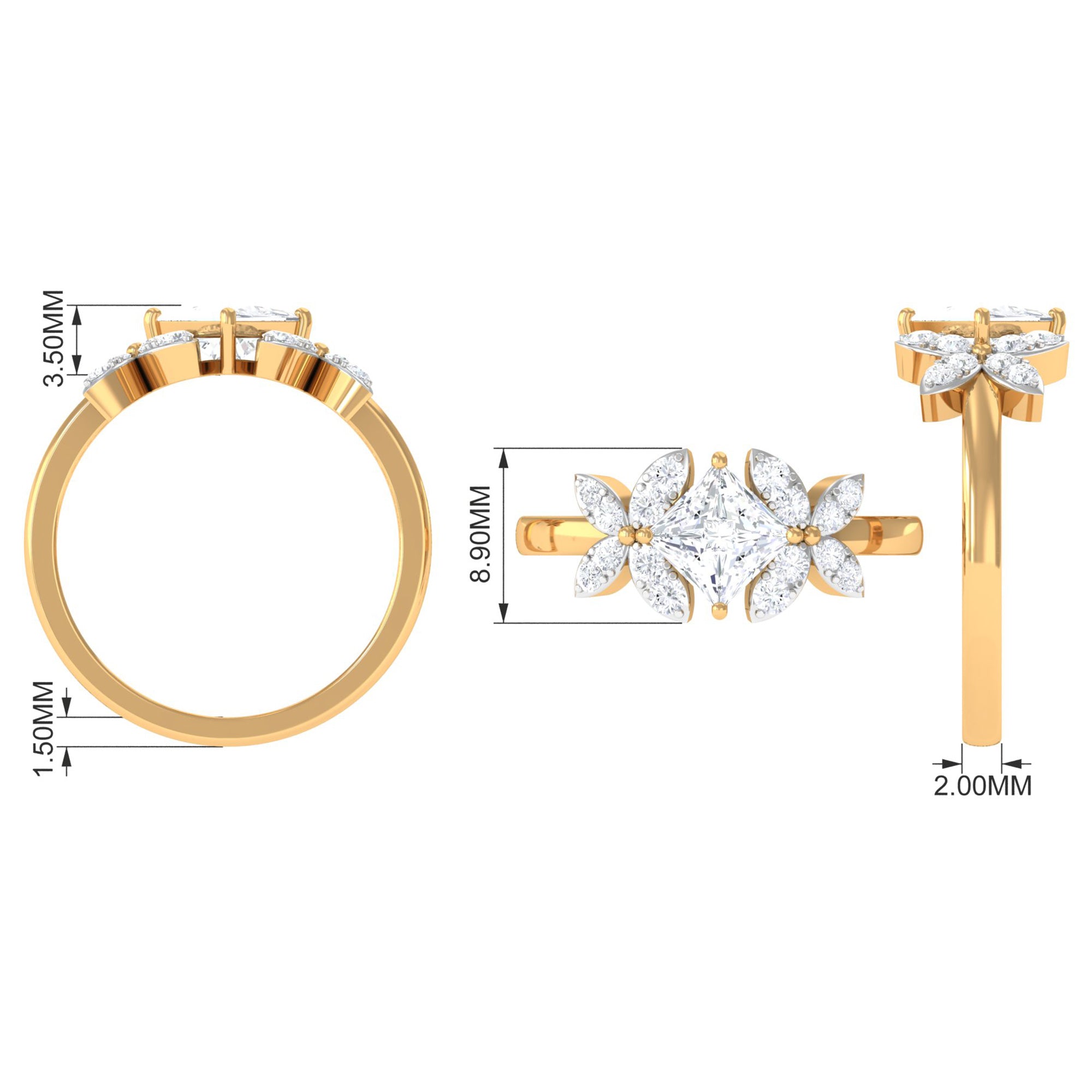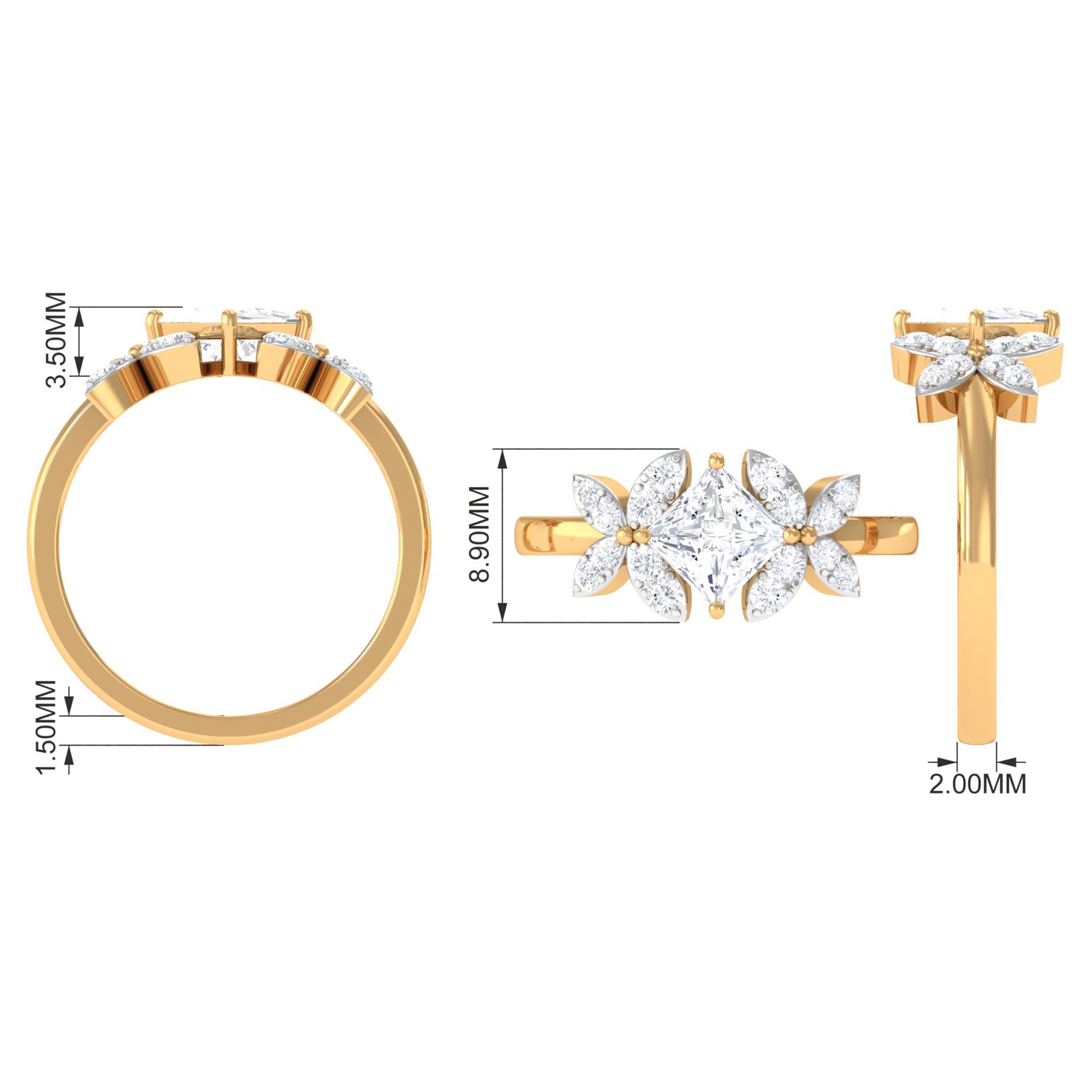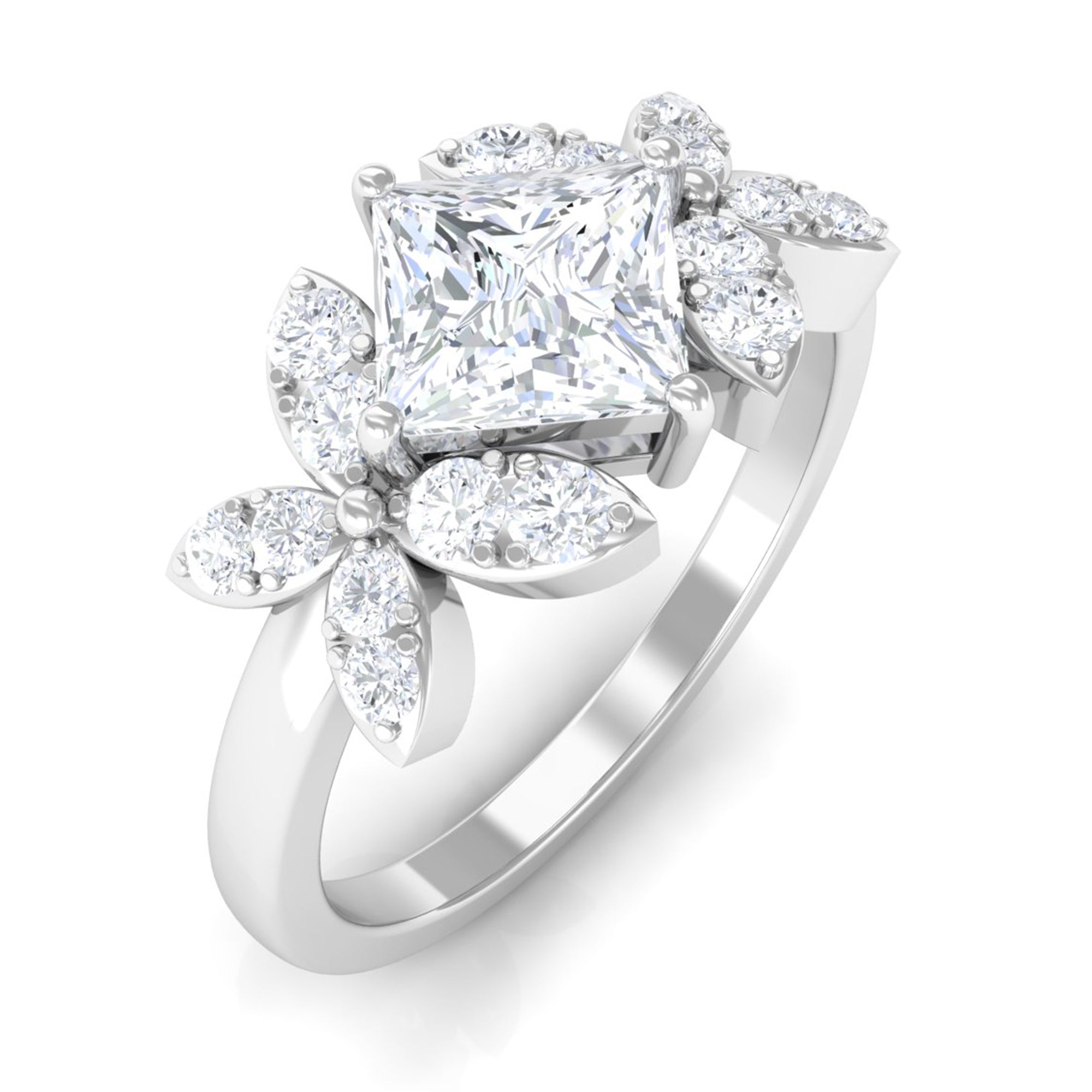 The subtle brilliance and magical charm speak with this CZ Ring. Adorned with Round and Princess Cut Zircon in Prong Setting on Floral Engagement Ring.