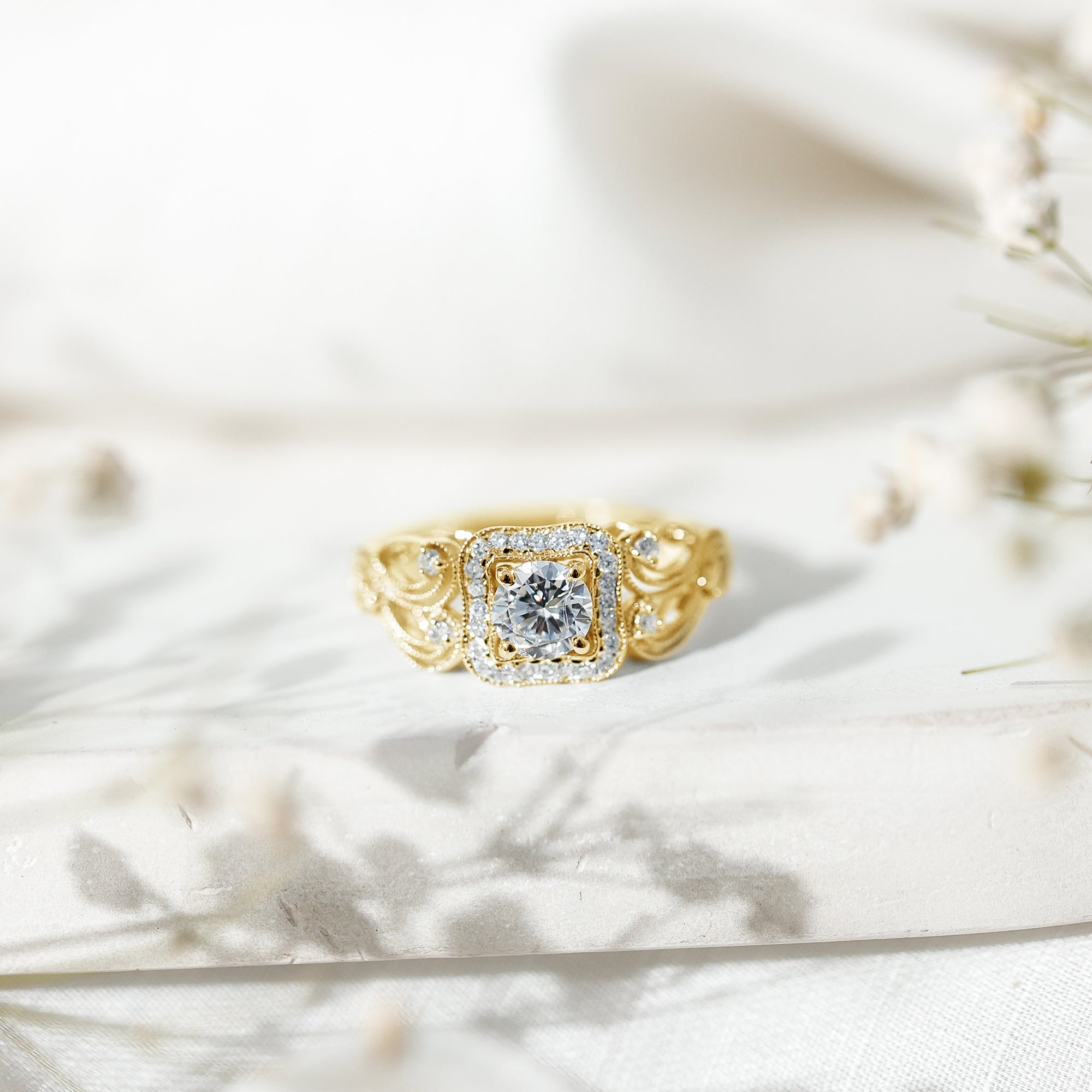 By combining a radiant center gemstone with a halo arrangement and vintage-inspired detailing, this ring presents a design that emphasizes both elegance and structure. The result is a ring style that reflects traditional design influences while maintaining a refined modern presence.